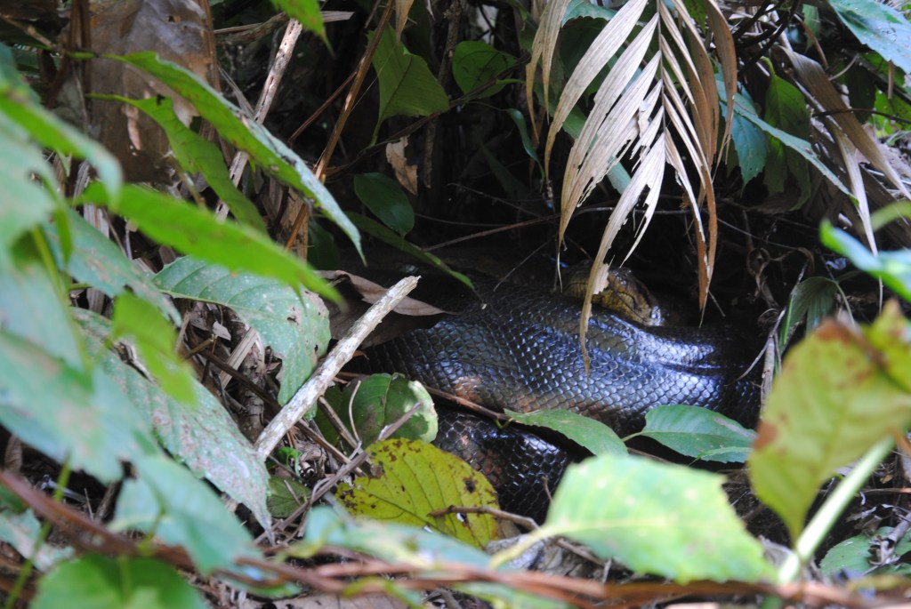 Elle nous annonce d’ailleurs qu’un autre spécimen, une femelle cette fois, a élu domicile au lodge voisin, de l’autre côté de la lagune. Deux anacondas dans la même journée ! Nous ne pouvons pas laisser passer cette chance. Après le déjeuner, Sergio embarque tout le monde, staff compris, pour aller vérifier l’information. Et elle est bien là, enroulée sur ces anneaux, tapie dans les fourrés à quelques mètres des cahutes. Vision exceptionnelle, qui rappelle étrangement la scène mythique dans laquelle Kaa hypnotise Mowgli dans le merveilleux Livre de La Jungle de Walt Disney.