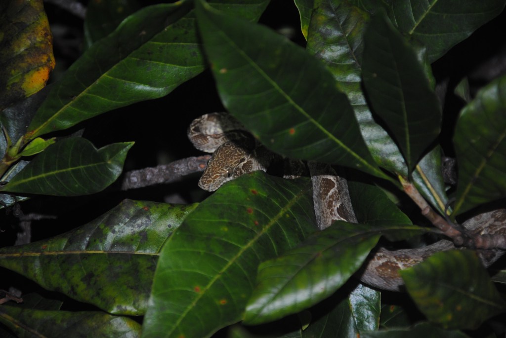 Les points jaunes quant à eux nous aident à dénicher les boas de jardin. Nous approchons deux magnifiques spécimens. Beaucoup plus petits et fins que l’anaconda, ils mesurent tout de même près de deux mètres. Avec leur robe brun clair aux motifs géométriques, leurs pupilles en ellipse, et leurs ondulations lentes, ils dégagent une hypnotisante grâce. Mais attention, cette élégance suave nous fait oublier la dangerosité de cet animal sauvage. C’est Jacob qui en fait les frais lors de notre seconde rencontre : alors qu’il déplace les feuilles derrière lesquelles le serpent cache sa tête, celui-ci se détend de tout son long et tente de mordre notre ami au doigt, avant de disparaître entre les branches. Plus de peur que de mal, puisque la tête du boa a simplement heurté l’ongle du pouce de Jacob. Mais une belle leçon tout de même. Cette péripétie marque la fin de notre navigation nocturne, et par la même d’un foisonnante journée dans la jungle.