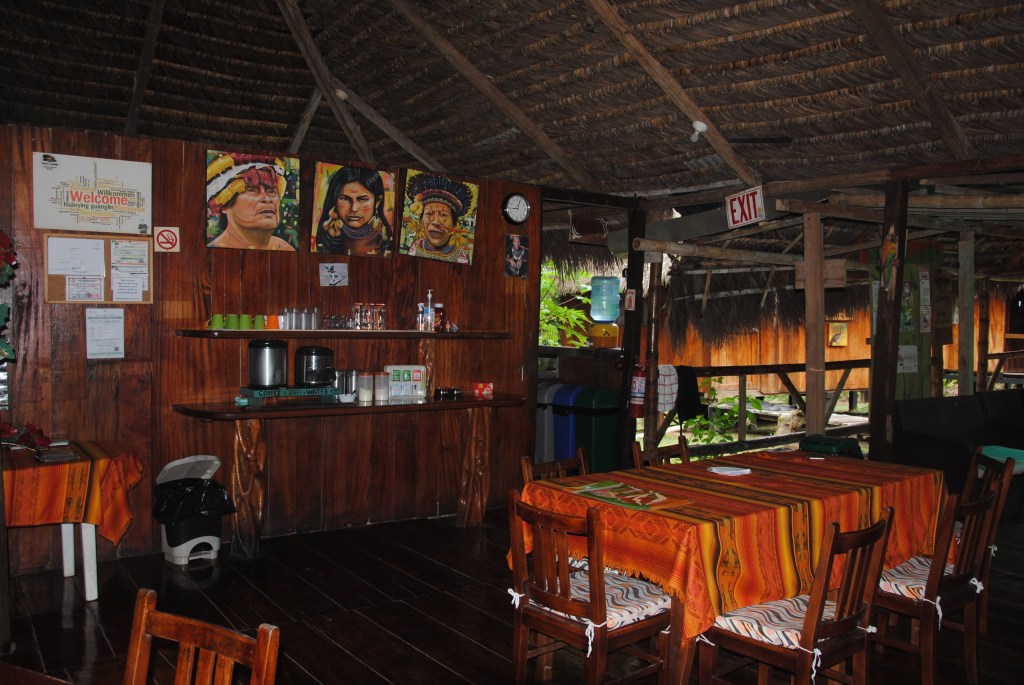 Nous débriefons des événements nocturnes avec la sympathique patronne et sa fille, autour d’un petit déjeuner, puis marchons vers le centre ville vers notre point de rendez-vous. Jacob nous accueille avec le sourire, et en français ! Tout en l’homme est affable : petit yeux très noirs, rieurs, rapprochés autour d’un nez fort et épaté, pommettes hautes sur un visage rond mais bien dessiné, et un sourire éclatant de bienveillance. Nous voyons tout de suite que nous sommes entre de bonnes mains. Jacob est Quechua, il est né et a grandi dans un village d’Amazonie, au bord de la rivière. Comme on le verra plus tard, c’est un guide passionné, et passionnant. Un véritable amoureux de la nature, de son Amazonie, doté d’un enthousiasme juvénile et communicatif.
