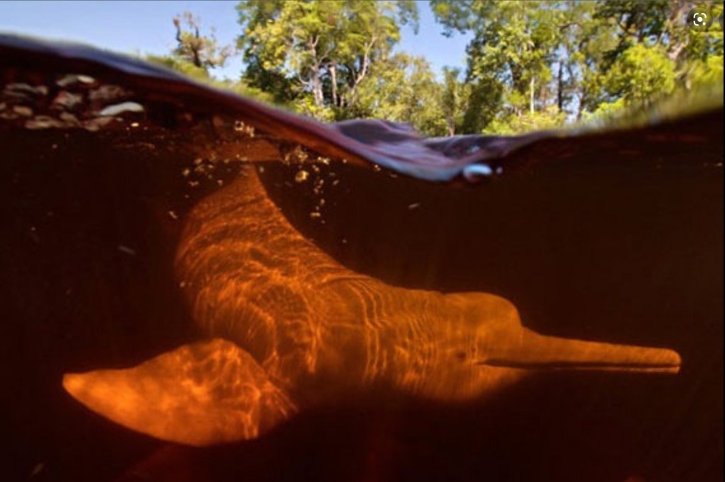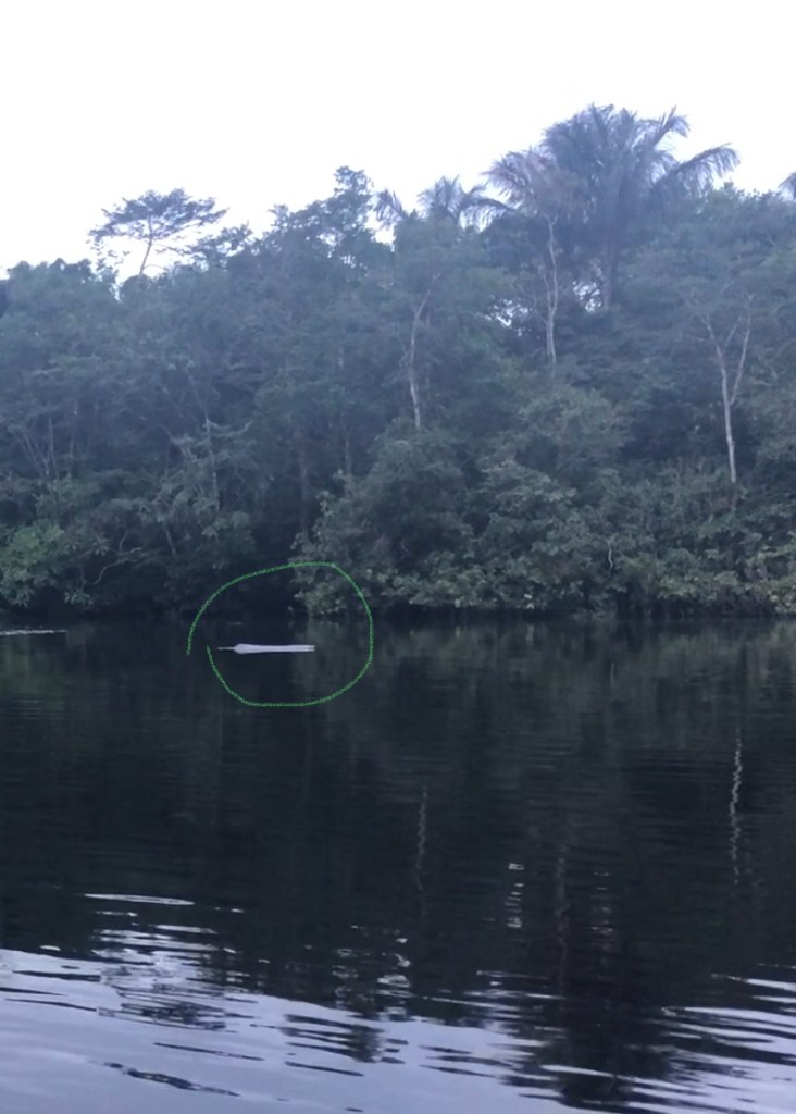 A l’embranchement de deux rivières, nous entendons de bruyantes expirations. Nous guettons la surface de l’eau en retenant notre respiration…Et une première masse rose et grise déforme l’onde ! Et puis une autre ! Et une troisième ! Ce sont les fameux dauphins roses de l’Amazonie, quelle chance de les observer ! Certes moins graciles que leurs parents des océans, avec leur front écrasé et leur long nez, ces étranges mammifères détonnent tellement avec l’environnement présent que nous sommes fort émus de les rencontrer.