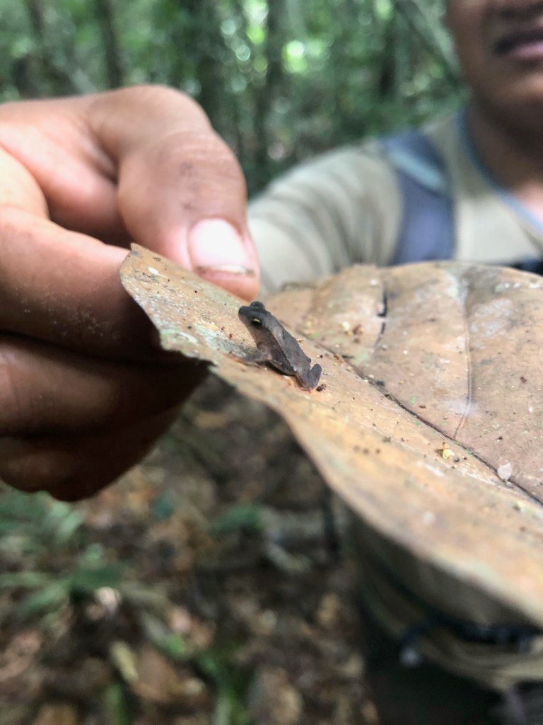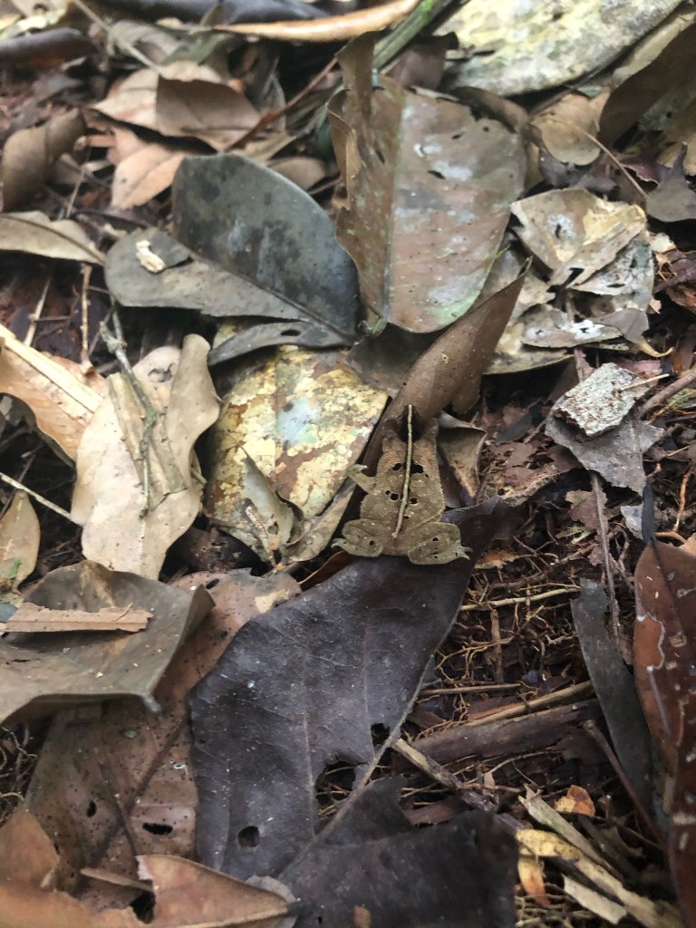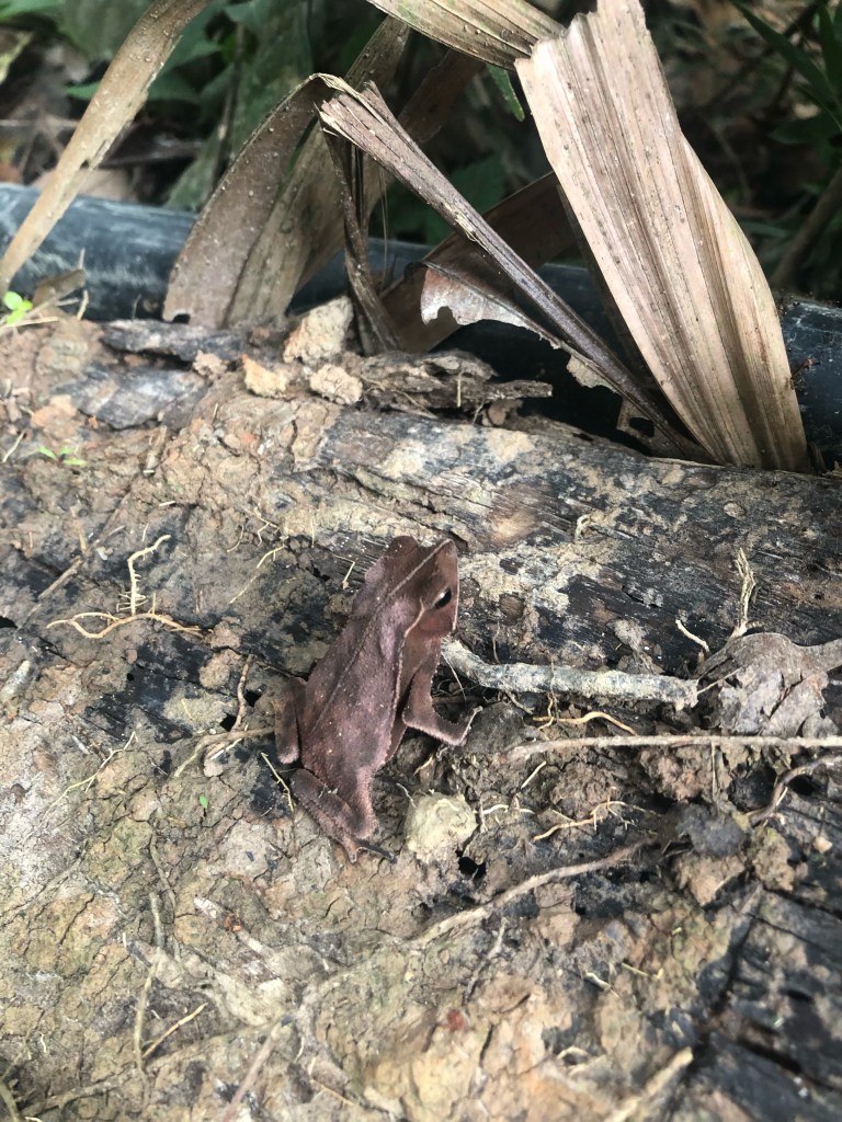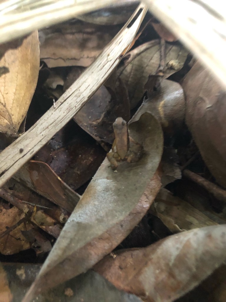 Nous croisons ensuite deux minuscules grenouilles dont le brun se marrie parfaitement avec le tapis de feuilles mortes. La seconde a la taille d’un ongle !