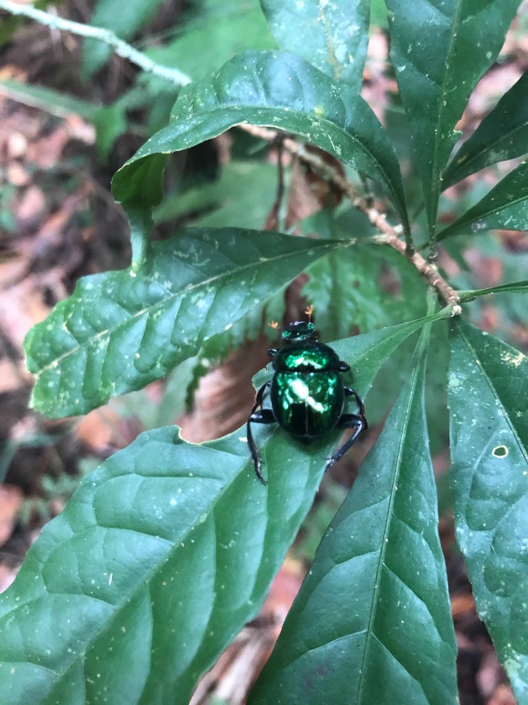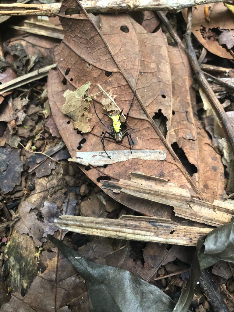 La suite de cette marche des horreurs est plus réjouissante. Alors que nous rebroussons chemin vers le lodge, nous croisons une nouvelle preuve de l’invraisemblable ingéniosité de la nature : un grillon feuille ! Le dos de l’insecte est une copie parfaite de feuille, même forme, même couleur, même les rainures sont identiques, quel prodige !