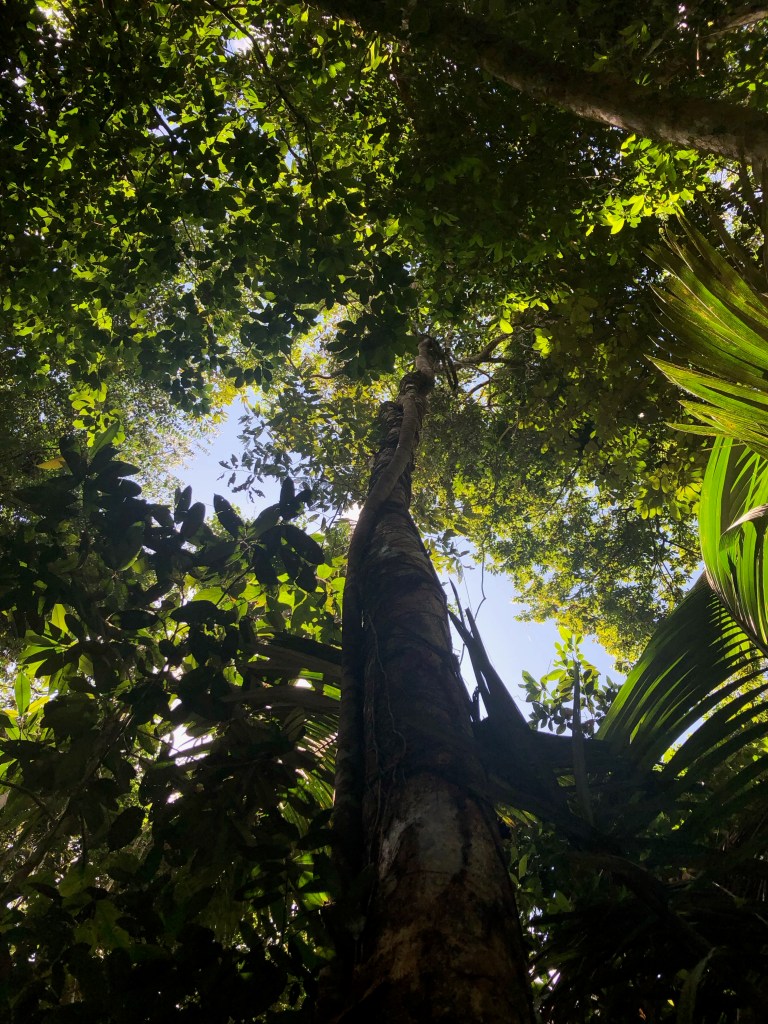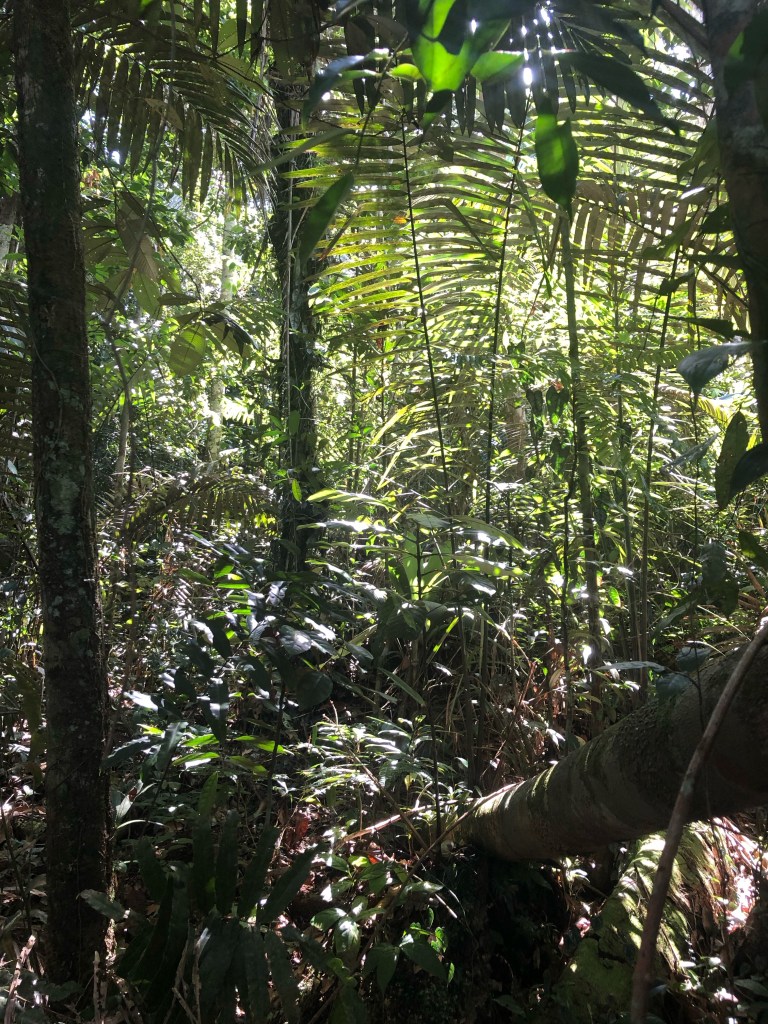 C’est en remontant du regard ces immenses troncs que nous apercevons un magnifique toucan à gorge blanche qui se fraye un passage vers les cimes. Cette apparition magique marque la fin de la promenade, nous faisons route vers le lodge. Cheminant dans cet épais entremêlement de lianes, troncs, arbres, fougères, dont chaque parcelle ressemble à une autre, nous nous disons que mieux vaut rester sur les talons du guide. Il est si facile de se perdre dans ce labyrinthe hostile !