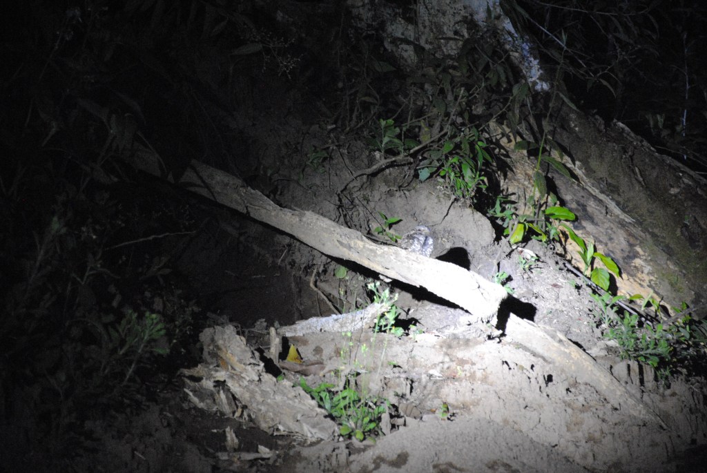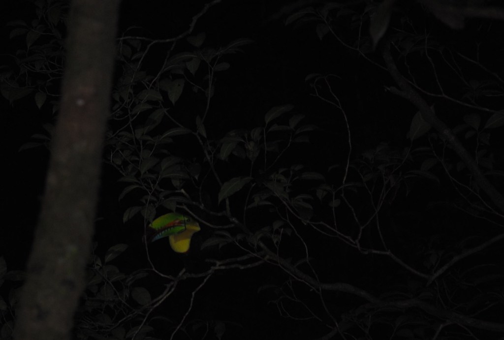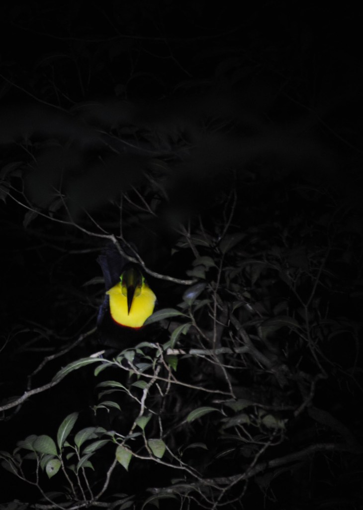 Point d’orgue de la soirée, Marco dirige sa lampe vers un somptueux “keel-billed toucan” au bec multicolore. Impassible, il se laisse admirer sous toutes ses facettes. Quelle merveille !