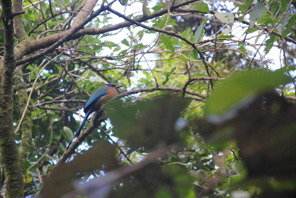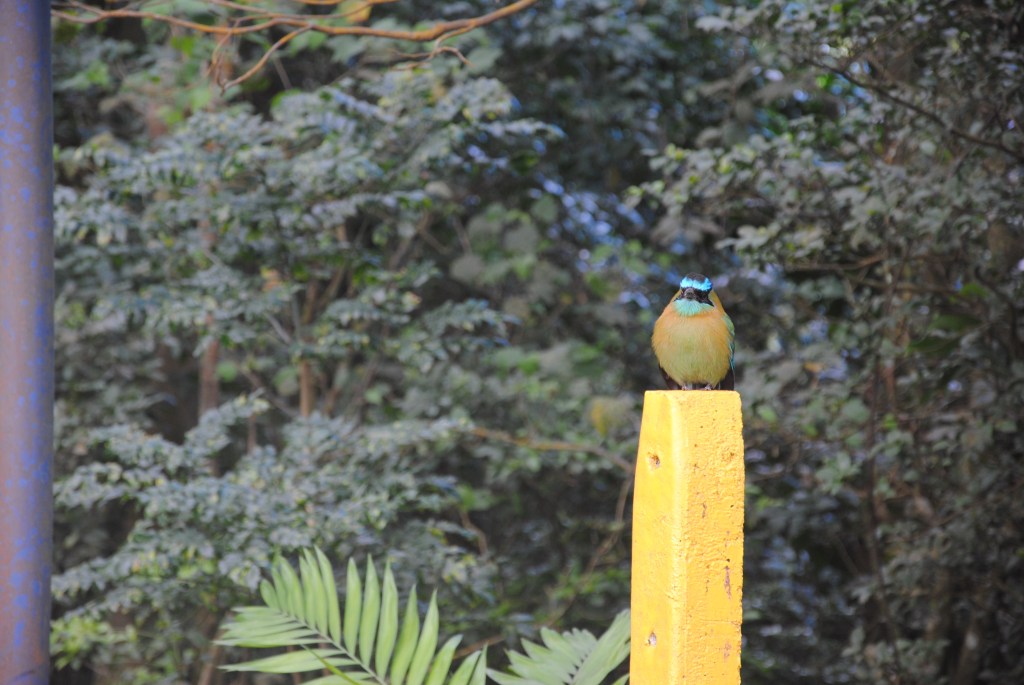 Je descends, et nous sommes immédiatement accueillis par un éblouissant motmot trônant sur un poteau.