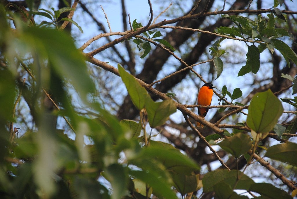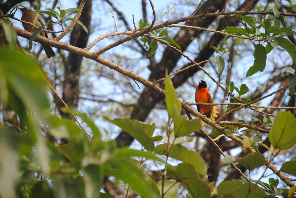 Alors que je profite d’un second passage de motmot, je distingue le chant si particulier des oropendolas, comme des gouttes d’eau qui tomberaient lourdement dans un large vase au goulot étroit. Marco m’apprend qu’il s’agit d’oropendolas de Montezuma, bec rouge et paupières blanches, la seule des trois espèces que je n‘ai pas encore vu ! La plus belle, aussi. S’en suit donc une longue chasse, à courir d’un arbre à un autre, télescope en main, afin de poser nos yeux sur ces chanteurs hors pairs. Grisante, l’entreprise s’avère néanmoins infructueuse, malgré les efforts de Marco.