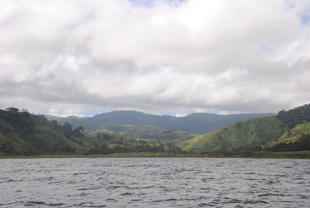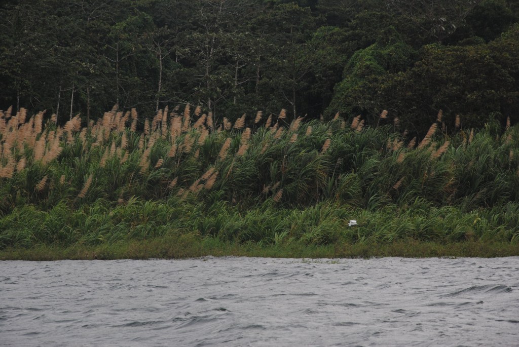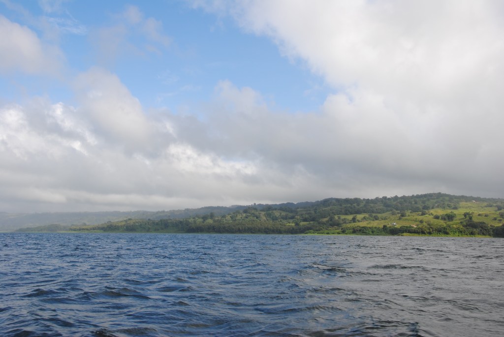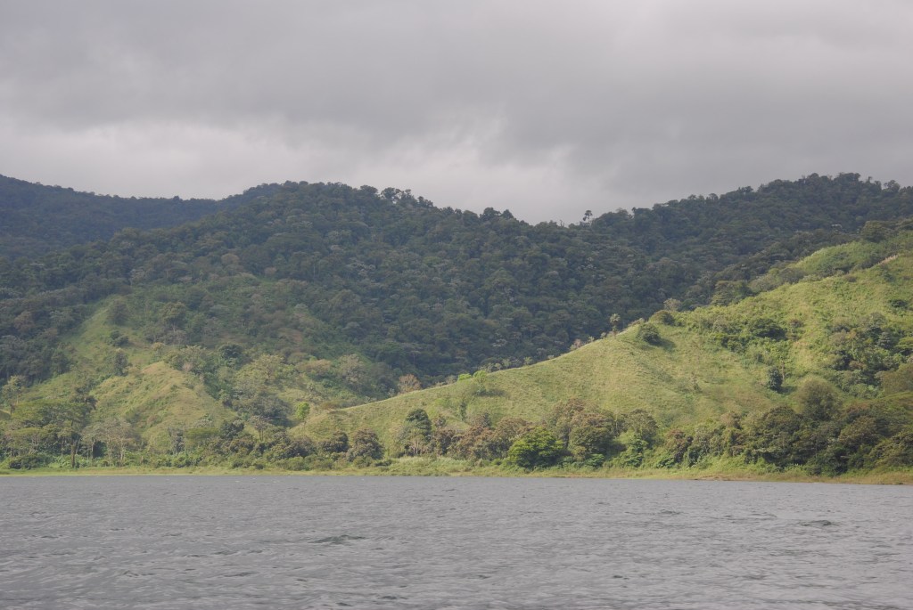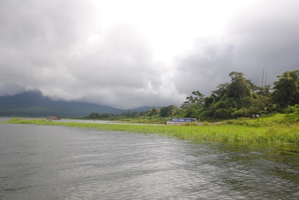 Ma journée commence sous les “feliz ańo nuevo” de la patronne. Puis un minibus vient me chercher à 8h, pour me mener vers Monteverde, un paradis de verdure situé de l’autre côté de la Laguna de Arenal. Le bus s’arrête au centre du village pour prendre d’autres passagers. J’ai la surprise, et le plaisir de voir Robert grimper à bord. Il devait en effet partir la veille. Le bus nous dépose à un embarcadère de fortune près d’El Castillo, d’où nous embarquons pour une traversée paisible de la lagune. Cet endroit est incroyable: à part quelques maisons éparses, le lac est entouré de terres sauvages ! Imaginez le lac d’Annecy, ou du Bourget, sans aucune construction, sans aucun pâturage. Nous voguons une belle demi-heure, en admirant les facéties du soleil qui colorent le paysage.