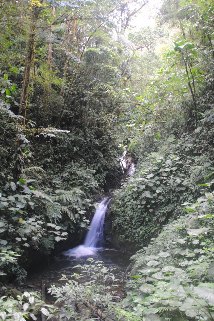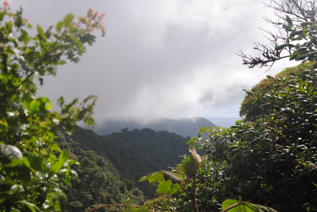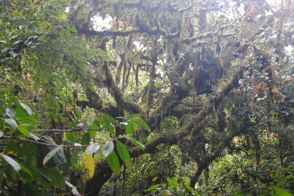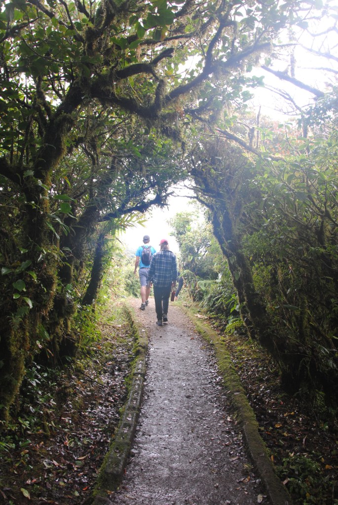 Samedi matin, Monteverde Backpackers. 6h30. La fine équipe est au complet pour partir à la découverte de la Réserve Santa Elena, à 6km au Nord-est du village. Le taxi nous dépose au parc, où nous attendons les Rangers pour l’ouverture. La forêt de nuages est engoncée dans une brume légère et uniforme, qui revêt le paysage d’un voile blanc. Nous nous enfonçons sur les sentiers, tapis de feuilles mortes humides et glissant. La pluie tombe, mais les différents étages de la canopée nous protègent des ondées. La forêt est magnifique. Comme le remarque habilement Robert, elle est plus “poilue” que celle de la veille, mousses et lichens tapissant arbres et sol.