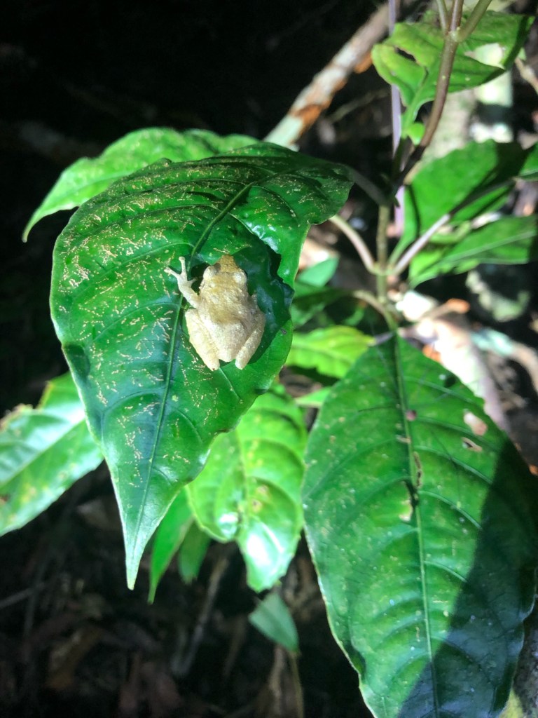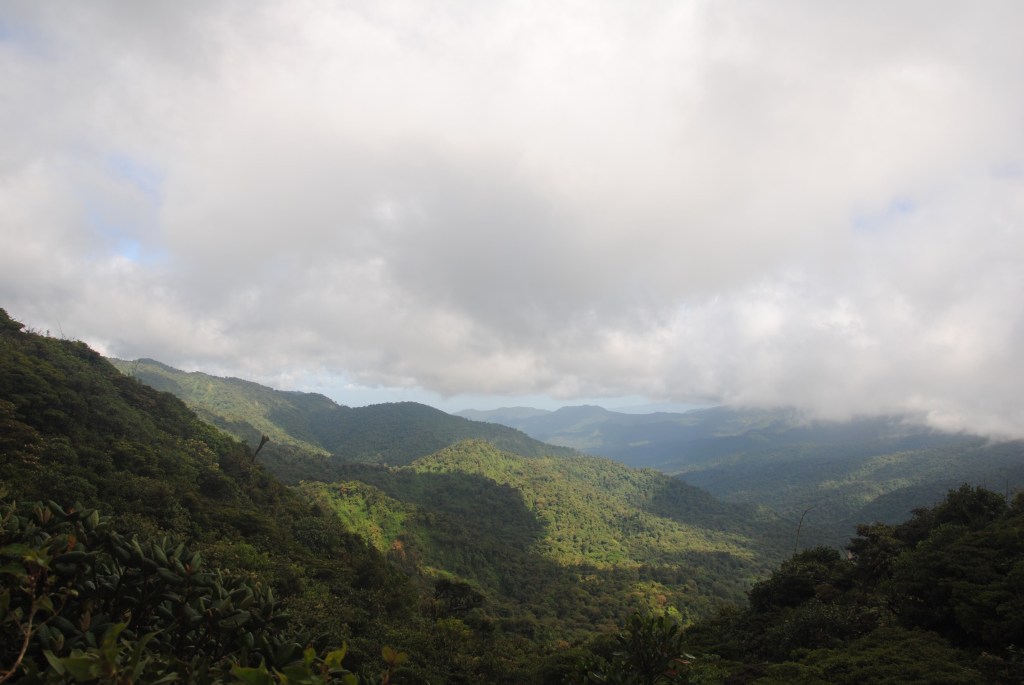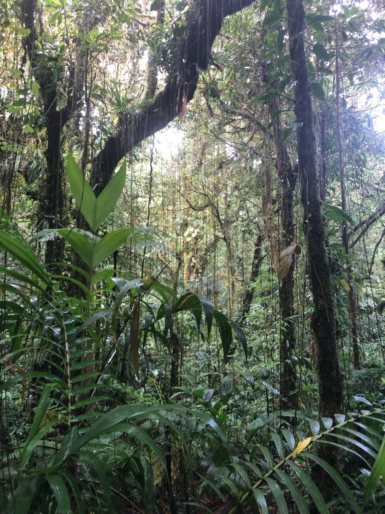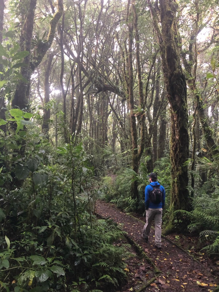 Nous rejoignions la sortie du parc, après pas moins de cinq heures de promenade rassérénante dans ses vertes travées. Le soleil fait son apparition, et nous convainc ainsi de rejoindre le village à pied. Les jambes lourdes, mais sans regrets car la balade en valait la peine, nous nous séparons alors, et nous donnons rendez-vous vers 18h pour un “night walk” à la recherche des habitants nocturnes de la forêt de nuages. Je passe la porte de l’hostel avec l’ambition de mettre mon carnet à jour et d’étudier la suite de mon parcours. Mais Marc, un voyageur canadien rencontré la veille est là, et nous reprenons la conversation où nous l’avions laissée hier soir. Alonzo, le gérant de l’établissement, se joint à nous, et l’après-midi s’écoule au rythme de nos échanges animés. Tant pis pour mes résolutions studieuses !