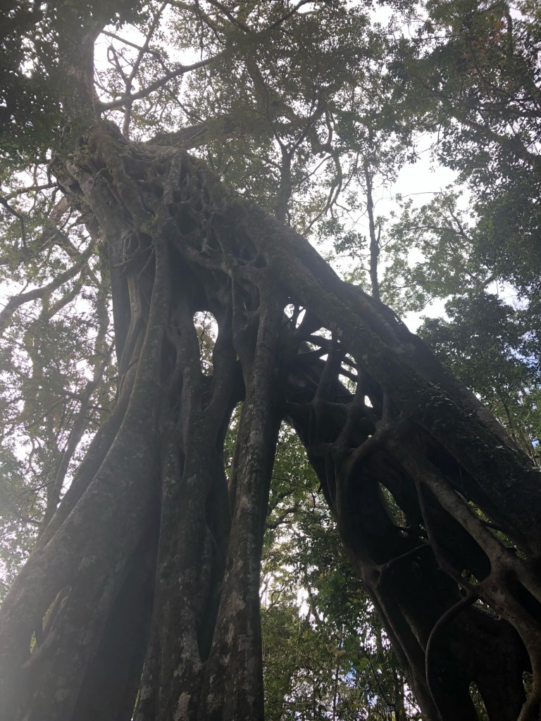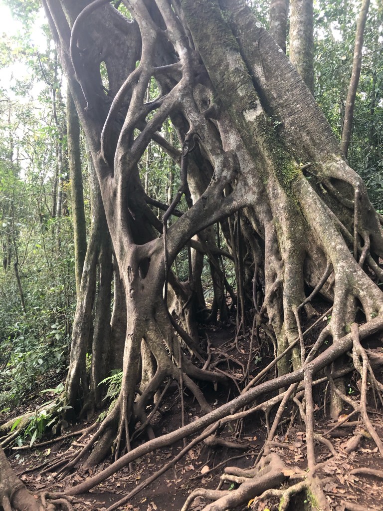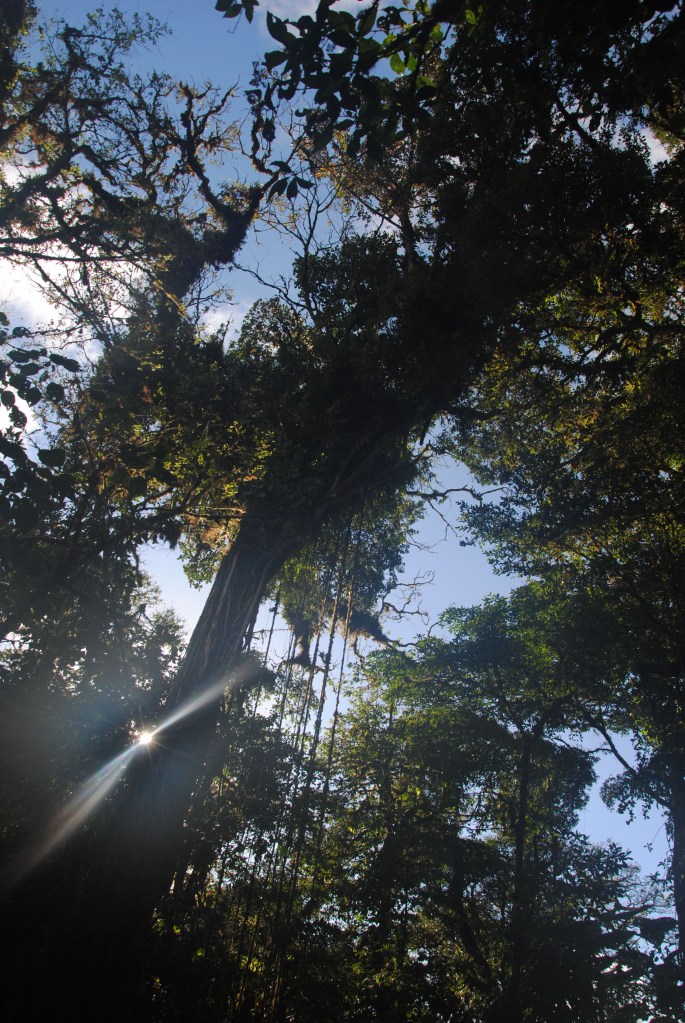 J’ai ensuite besoin de me dégourdir les jambes. Une courte promenade dans les vallons monteverdois me mène au fameux ficus tree, un immense arbre gruyère au milieu de la forêt. Le jeu en vogue ici est de grimper à l’intérieur du tronc, s’aidant des branches et racines noueuses. Je me lance mais suis très vite rattrapé par mon vertige. Je ne ferai donc pas mieux que sur la tour infernale de la réserve Jatun Sacha, à Tena…