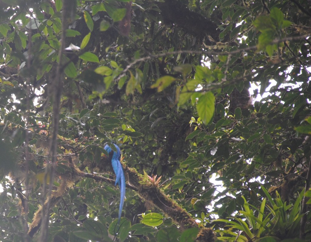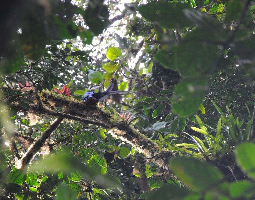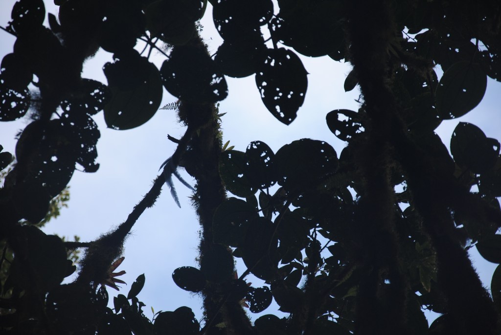 Alors que nous rejoignions la sortie après trois heures d’errance méditative dans les méandres de terre du parc, un sympathique guide nous indique la présence d’un Quetzal, merveille de la forêt, sur l’un des sentiers environnants. À pas feutrés, mais énergiques, nous nous hâtons vers le secteur où l’oiseau miracle a été aperçu. Arrivés sur la zone, nous scrutons chaque branche avec application. Damien attire notre attention sur un conséquent amas de guano frais. Instinctivement, nous levons la tête pour retrouver la source de ces abondantes déjections. Je devine alors deux longues plumes, en forme d’étroites fougères.