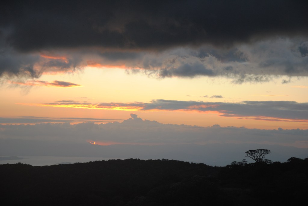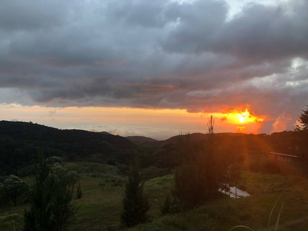 Heureux, nous sortons du parc et rejoignons le village à pied. La balade est superbe, et nous arrivons à Monteverde à point pour le coucher du soleil. La scène est splendide, avec ce ciel aux nuages effilés qui rougit derrière les vertes collines.
