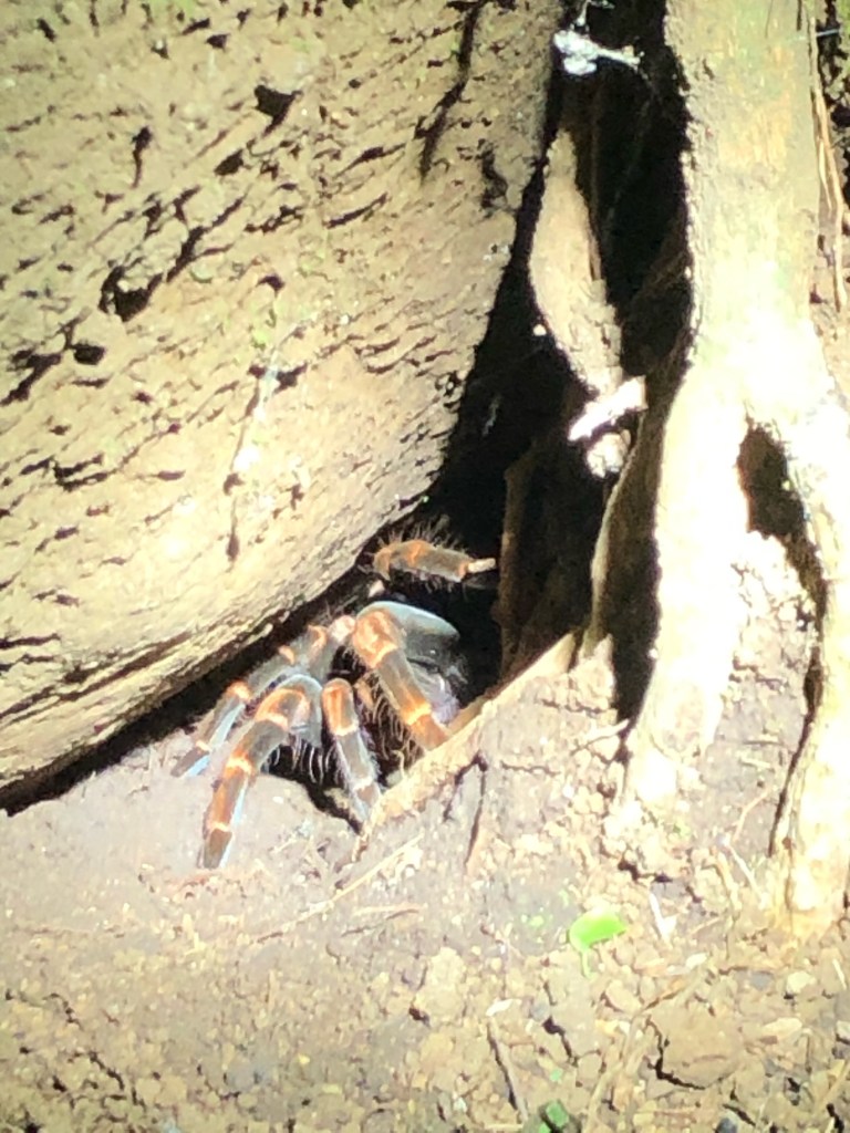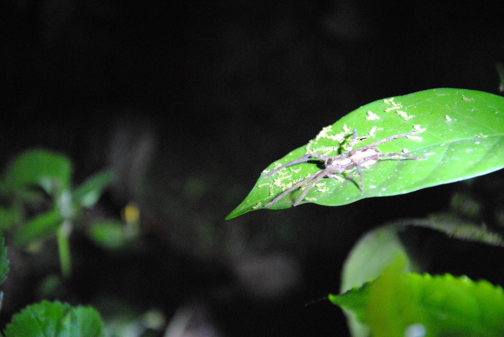 Robert et Damien sont là, à 18h, ainsi que Marco, notre guide pour la soirée. Nous nous laissons guider, lampes de poche en main, sur un petit sentier, bercés par la douce musique de la nuit. Hauts perchés dans les arbres, carcajoux et lémuriens se disputent les fruits de la forêt. À nos pieds, les tarentules sortent chasser dans les environs immédiats de leurs terriers. Coquettes, mais timides, elles se montrent le temps d’une photo puis filent à reculons dans leurs cachettes. Velues et colorés, la démarche souple et agile, je me surprends à leur trouver un charme irrésistible. Il n’en est pas de même pour les araignées loup, dont les toiles épaisses tapissent les pentes de ces bois. Leurs pattes anguleuses et leur abdomen bombé leur donnent un aspect terrifiant…