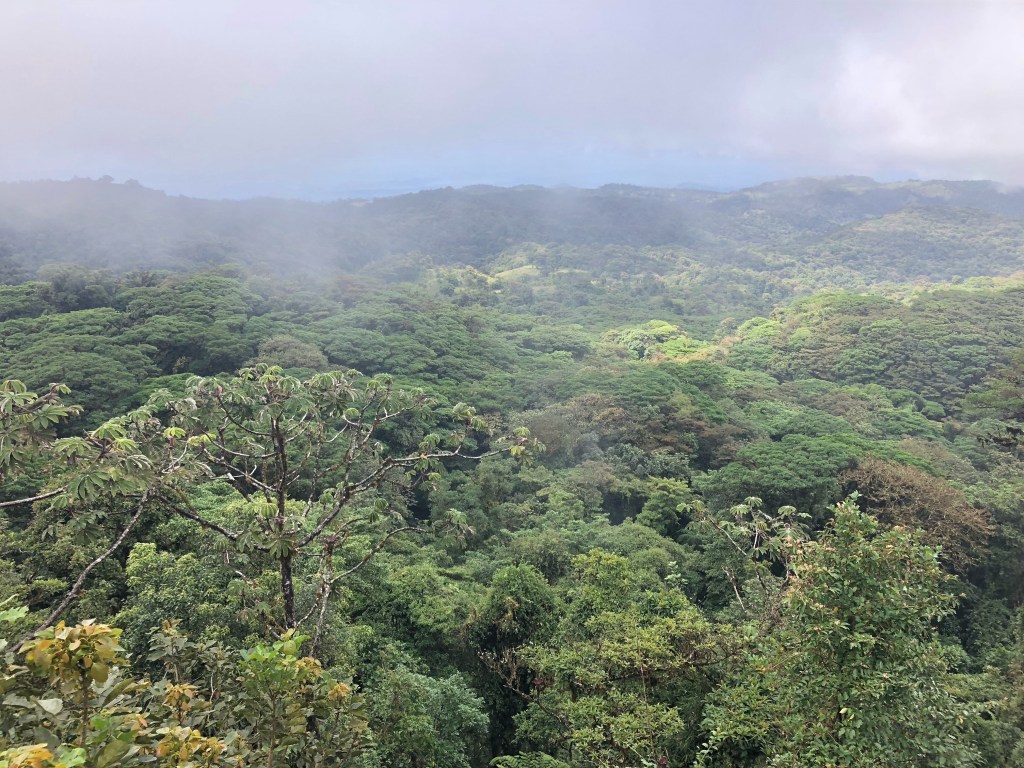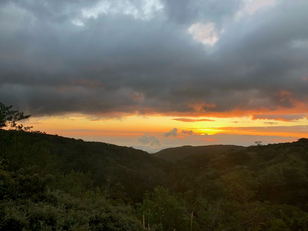 Ces émotions nous ont donné faim, nous dînons tous les trois dans un chouette restaurant dont la terrasse nous offre une vue magique sur les dernières lueurs du jour. Superbe journée dans les collines luxuriantes et vallonnées de Monteverde !