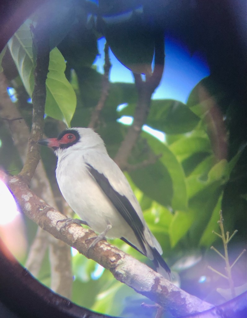 Le tityra masqué, paré pour le carnaval avec sa robe blanche et son masque rouge et noir;