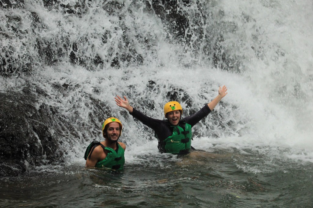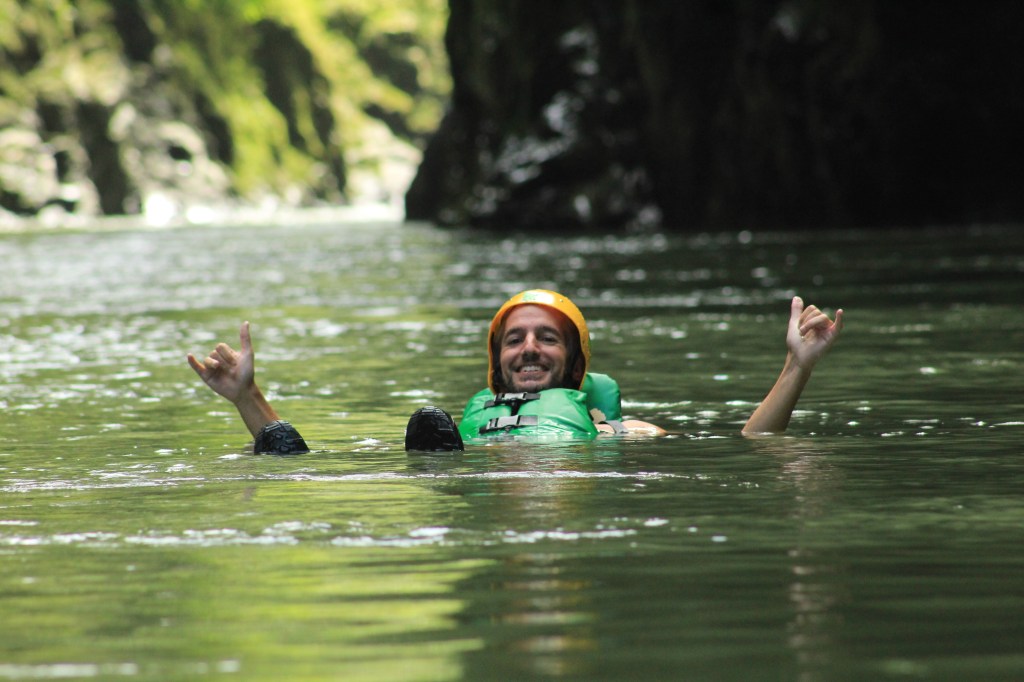 Entre deux passages sportifs, la rivière nous laisse tout le loisir de contempler les environs. Nous traversons ainsi un majestueux canyon, où une immense cascade se déverse avec grand fracas dans le cours d’eau. Parfois, avec l’autorisation de Luis, nous sautons par dessus bord et nous laissons porter par le courant, en toute décontraction.