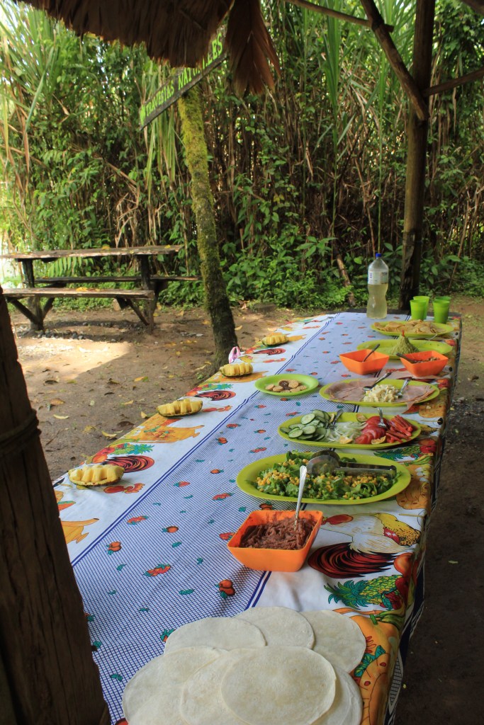 De retour dans le cannot, nous pagayons gaiment vers notre déjeuner. Pour tout restaurant, une table de bois protégée des rayons du soleil par un toit en feuille de palmiers. Mais Luis et Alejandro ont dressé une superbe table : au menu, burritos et ananas frais. Nous dégustons ce festin en parlant voyages avec Kristle. Je découvre l’existence du Delta d’Okavango, au Botswana, que ma coéquipière décrit avec tellement de justesse et d’émotion qu’on s’y croirait presque.