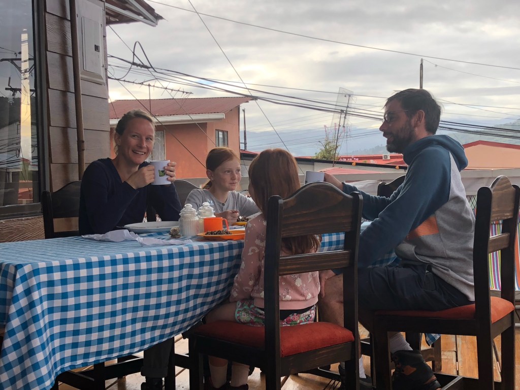 Alejandro nous montre les photos qu’il a prise de son kayak, puis nous rentrons à l’hostel. Je salue l’énergique Kristle, qui fait route vers la côte pacifique, et retrouve mes acolytes sur la terrasse. L’après-midi est bavarde, nous profitons de la quasi absence de connexion pour s’offrir un moment d’humanité, bien tangible. Vers 18h arrive une nouvelle invitée, qui bientôt se joint à nous. Lisa est allemande, et, entre deux jobs, s’offre un long séjour au Costa Rica. Après un apéro et un dîner joyeux, une fois les petites couchées, la terrasse se transforme en tripot. Les parties endiablées de « président » sont ponctués de rires. Grand moment de bonheur partagé, dans un lieu simple mais baigné d’une authentique chaleur. Nous savourons cet instant car demain, nos chemins se séparerons. Marie, William, et la famille de voyageurs se rendront à San Jose pour voler vers d’autre cieux. Lisa conduira vers le sud de la côte Caraïbes avec un passager heureux de saisir l’opportunité de ne pas prendre trois bus différents…L’étape à Turrialba aura eu son lot de belles découvertes, et de superbes rencontres !