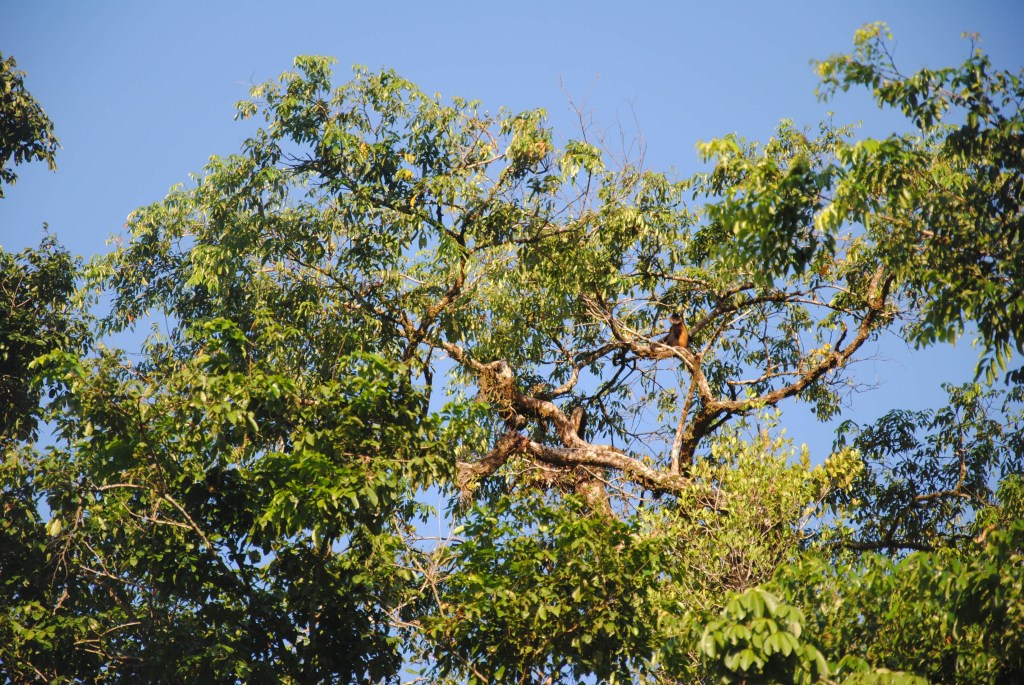 Les aboiements des singes hurleurs nous indiquent le quartier des primates. Nous les surprenons en plein festin de feuilles fraîches à la pointe d’une île verdoyante, tandis qu’en face trois singes araignées rivalisent d’adresse, suspendus à la canopée.
