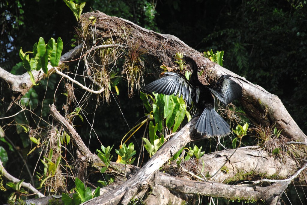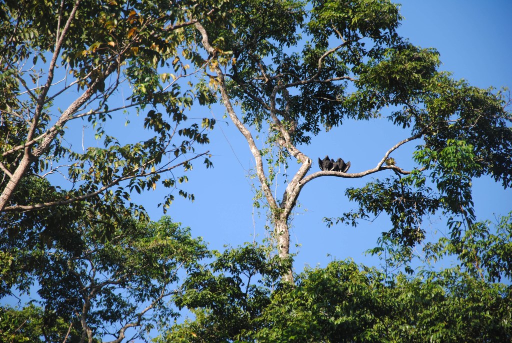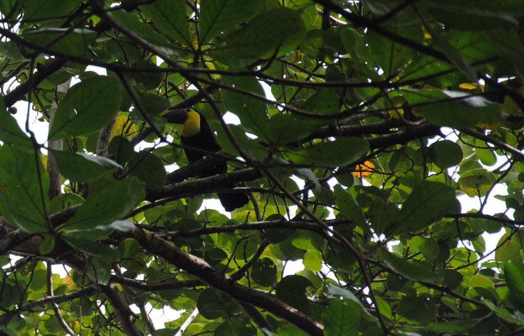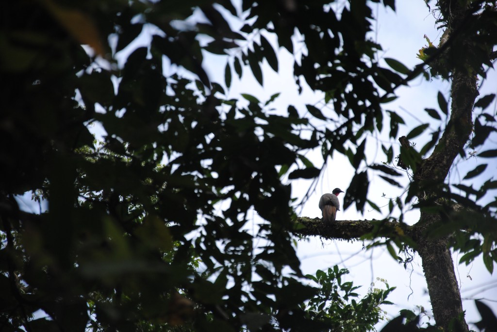 En face, grâce à un trou dans la conopée, on aperçoit une crested guan posée sagement sur une branche.