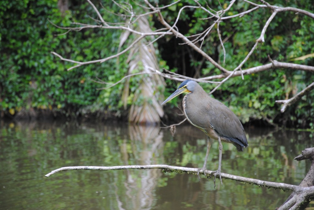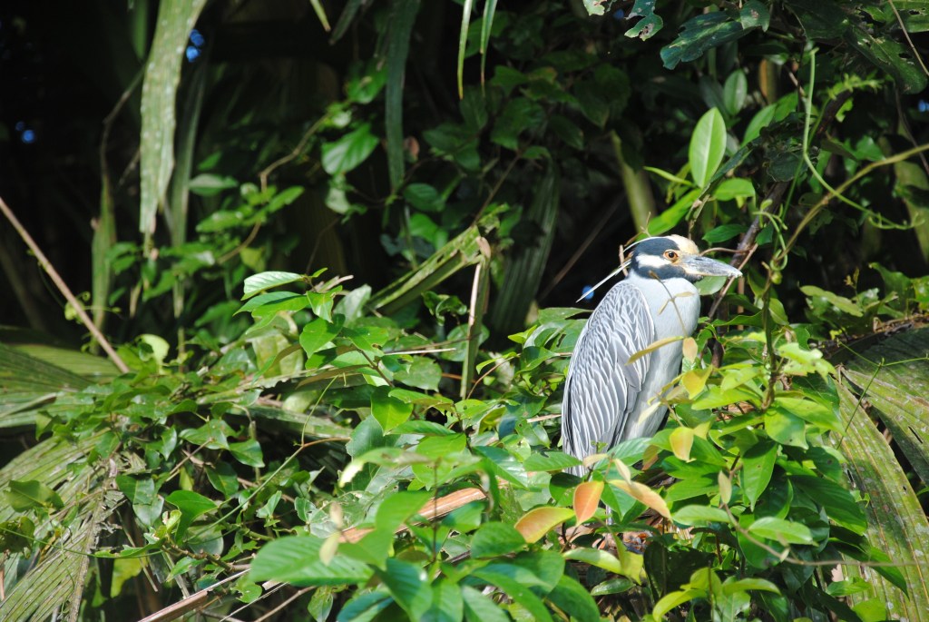 En avance, je suis prévoyant, mais pas clairvoyant : le bus arrive, je charge mon sac dans la soute, monte à bord, avant de redescendre, de reprendre mon sac, et de voir mon bus pour Limon partir, une rue plus haut. Je rejoins donc le bon arrêt de bus, et attends le suivant, celui de 6h30. Il est à l’heure, et moi au bon endroit, je grimpe, et entame ainsi un long voyage. J’arrive à La Pavona vers 15h, quatre bus plus tard. Le reste du voyage s’effectue par voie fluviale, sur une de ces méandreuses rivières dont le Costa Rica a le secret. Le soleil brille dans un ciel bleu immaculé. Mon voisin, Roberto, guide naturaliste, me pointe les hérons, iguanes, et crocodiles qui jonchent notre parcours. L’ambiance à bord est festive : une joyeuse bande de jeunes Costariciens éméchés diffuse une musique médiocre mais entraînante, et notre pilote invective à grands bruits les embarcations que nous croisons. Je fais la connaissance d’un trio de jeunes Genevois qui comme moi poseront leurs bagages à l’hostel Aracari Garden.