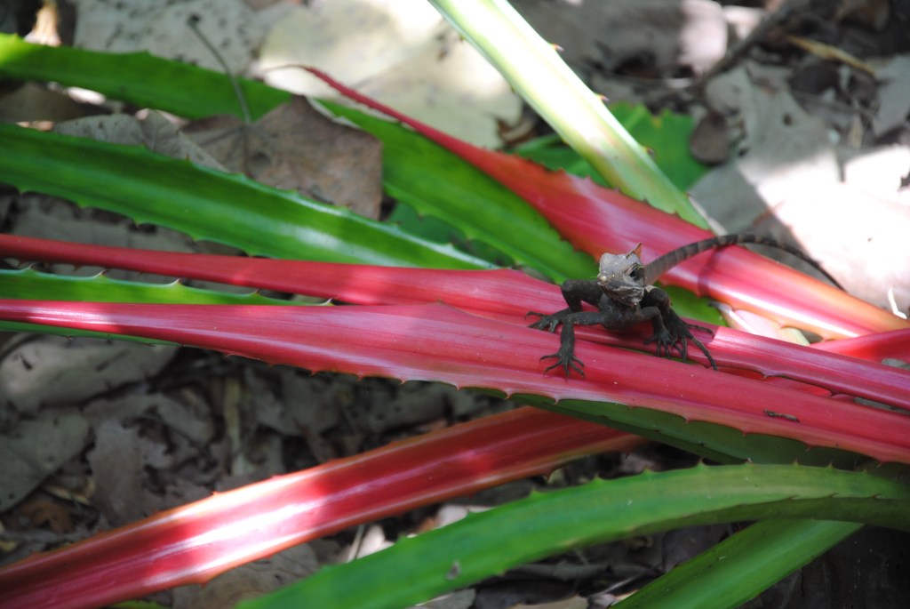 Au hasard d’un regard, je tombe sur un lézard très étrange, à crête, presque blanc. Un jeune basilic, peut-être ?