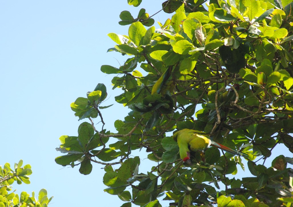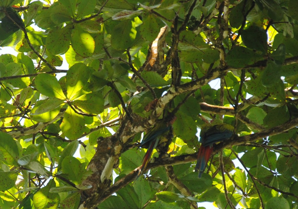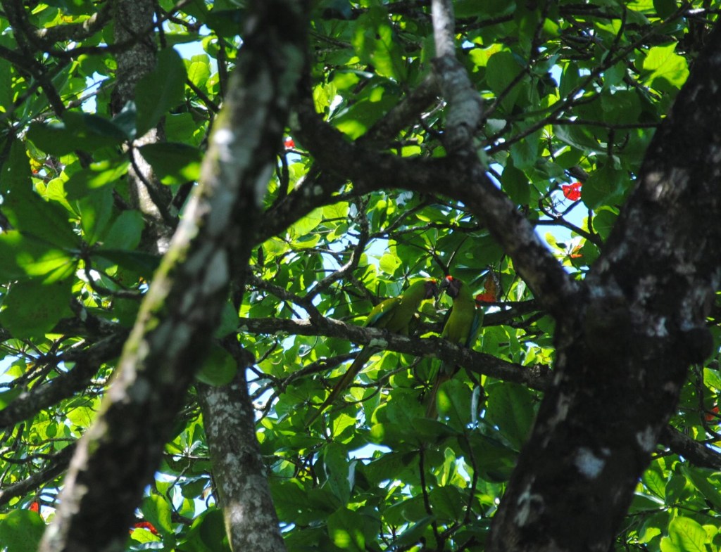 Le village à peine dépassé, je traverse un terrain jonché de grands arbres, d’où parvient une bruyante litanie. Quatre couples de grands aras verts se nourrissent dans les branches ! Quelle aubaine ! Le soleil fait une (courte) apparition pour me permettre de capturer en images ces superbes oiseaux.