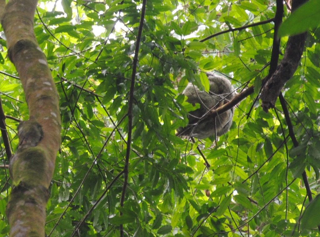 À droite du sentier, une boule de poils grise : un paresseux dort, recroquevillé sur lui-même.