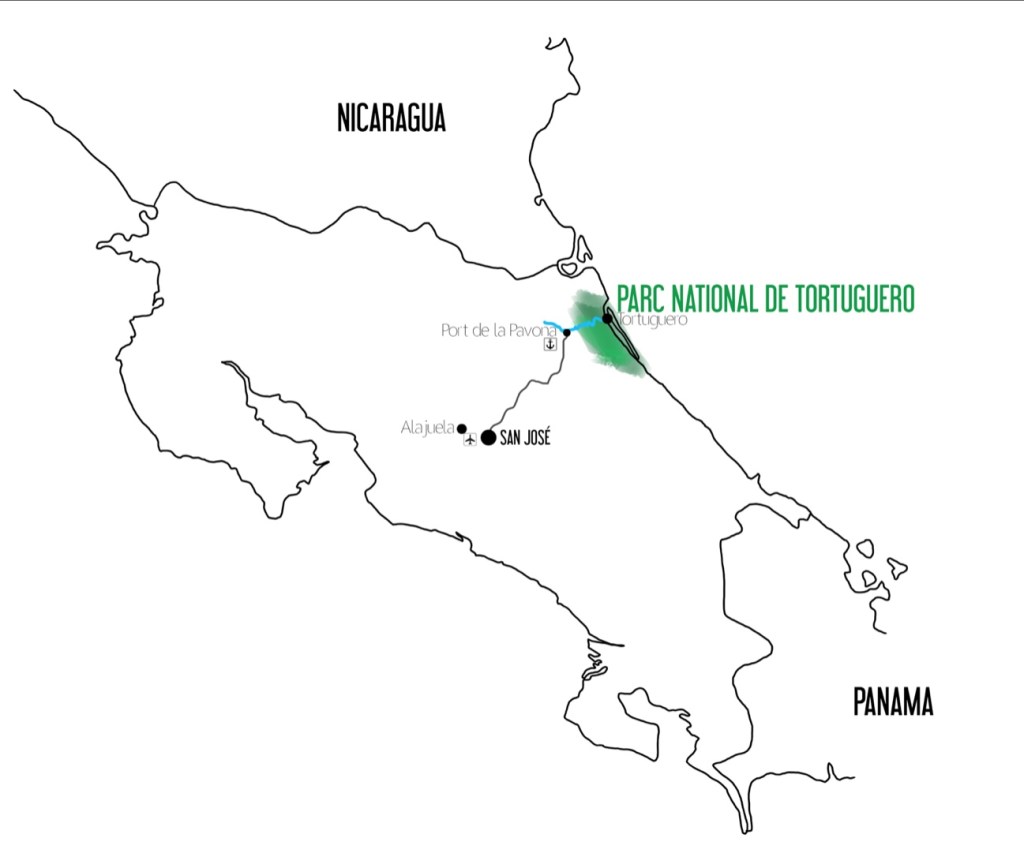 Nous découvrons Tortuguero, une interminable bande de terre étroite, bordée à l’Ouest par le Rio Tortuguero, à l’Est par l’océan Atlantique. Le village se résume à quelques maisons donnant sur le fleuve, et les environs sont dominés par une magnifique forêt côtière. Au sud de la fine presqu’île, l’entrée du Parc National.