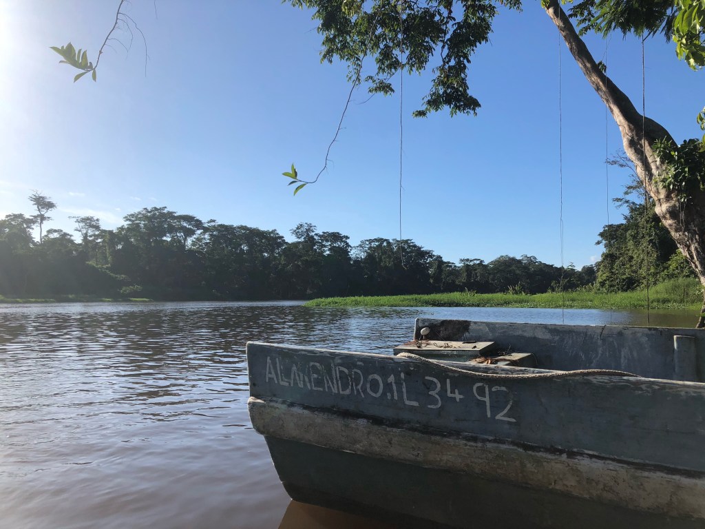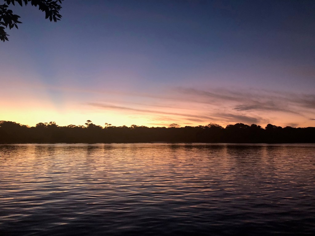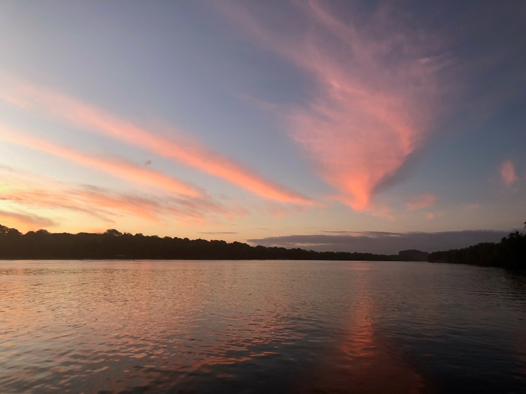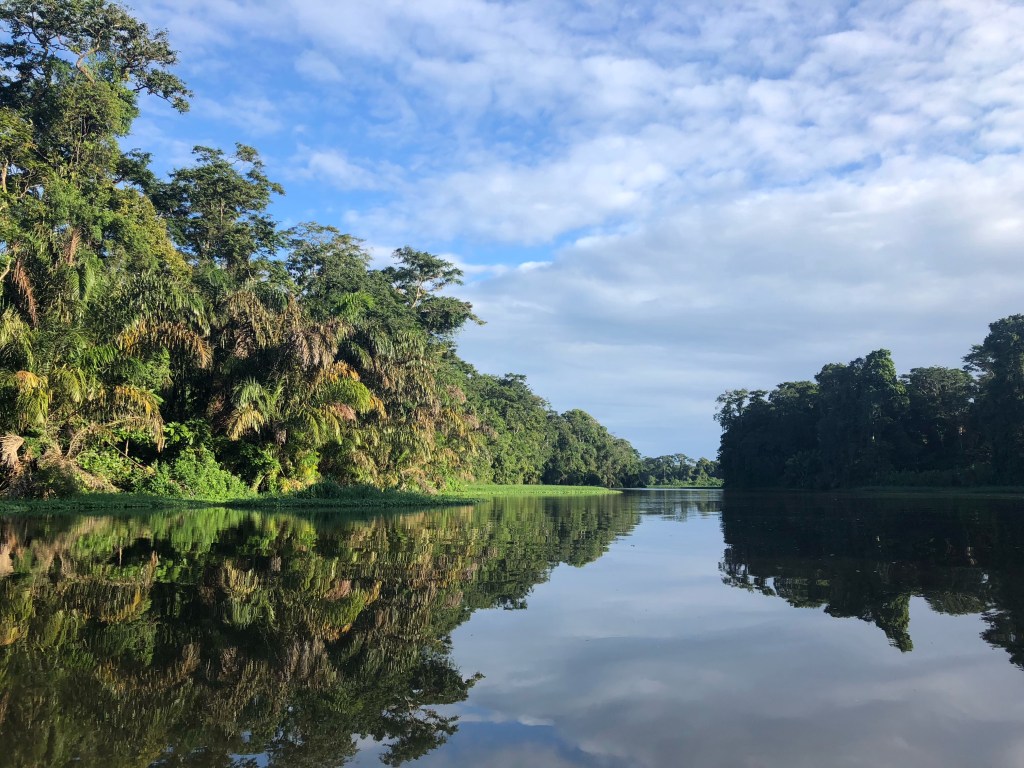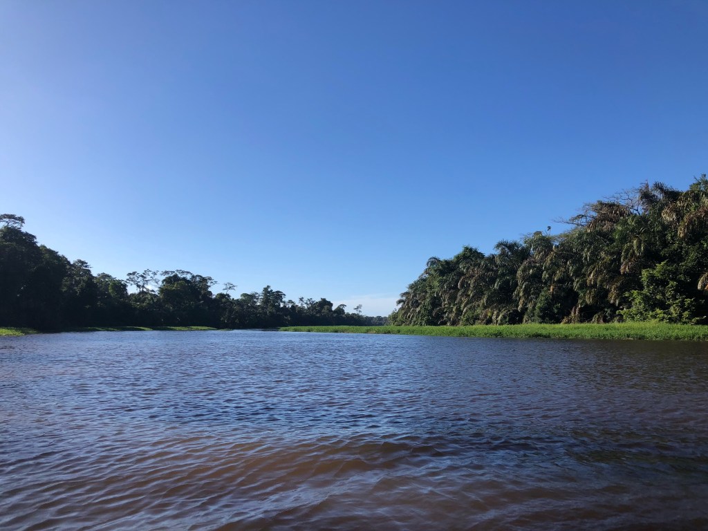 Pas de moteur dans ces lieux, nous profitons pleinement de la musique sauvage de ce paradis vert. En tendant l’oreille on entend le bruit régulier du ressac. Le va-et-vient de la pagaie d’Israel, le bruissement des feuilles sous l’effet du léger vent complètent cette hypnotisante bande sonore. Les cris rauques et stridents des perroquets troublent la quiétude du fleuve, mais le spectacle de leur robe colorée compense le désagrément.