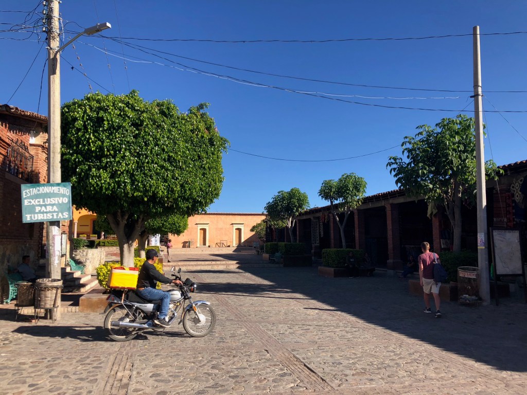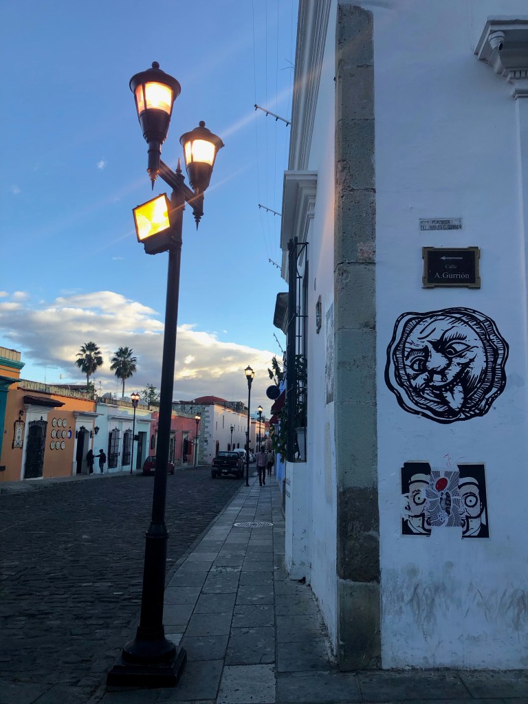 Je jette mon paquetage dans le dortoir et sors profiter des dernières lueurs du jour pour arpenter les rues de la cité. C’est jour férié aujourd’hui et elles sont animées. Les maisons de pleins pieds accueillent bars accueillant, élégants restaurants, et échoppes en tout genre. Les boutiques de Mezcal, la fierté locale, fleurissent au milieu des façades recouvertes de graphiques fresques de rues.