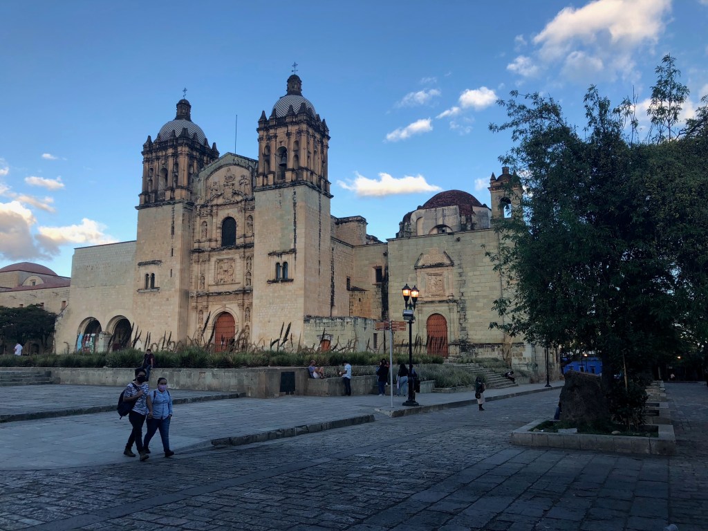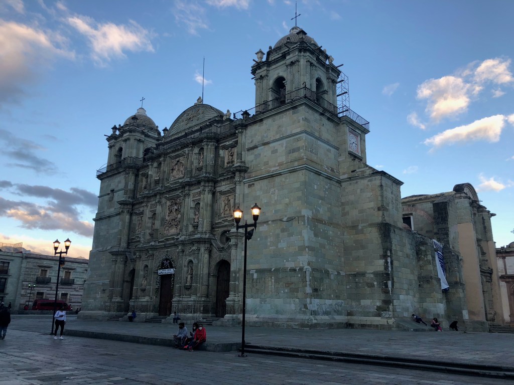 Je m’éponge le visage, puis reprends ma route. Mes pas me portent instinctivement sur le parvis du couvent San Domingo. Je trouve, malgré un soleil au zénith, quelques marches à l’ombre pour mes leçons quotidiennes d’espagnol. Lorsque l’ombre disparaît, je trouve refuge dans la cours d’une jolie église aux dômes rouges, d’où je bouquine un moment, appréciant le calme de l’endroit. Je repasse pas l’auberge afin de prendre une douche, et y retrouve Boutayna et Jonhatan. Ensemble, nous rejoignons Alexa et Joâo, très sympathique couple austrio-portugais, dans un chouette restaurant à deux pas de l’hostel. Le dîner est joyeux et animé, et la nourriture délicieuse ! Je prends congé de la troupe afin d’aller prendre mon bus. Nous nous promettons de nous revoir dans quelques jours à Puerto Escondido, la destination pour nous tous excepté Boutayna, qui partira vers le Chiapas.