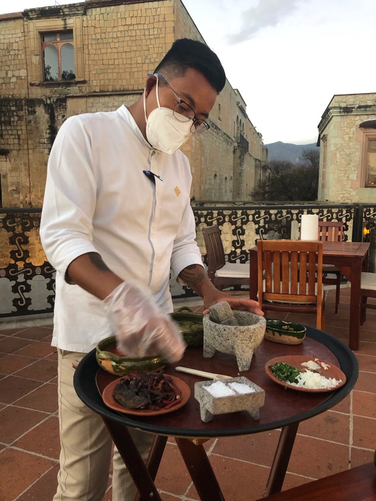 C’est donc naturellement que j’y choisi un restaurant, dont le toit terrasse donne sur l’aile sud de l’église. Je pénètre dans le patio de l’établissement et réalise, devant le raffinement de la salle et du service, que mes goûts de luxe m’ont rattrapé…Mais qu’importe, comme dirait Papa (et Sénèque): « la vie, ce n’est pas attendre que l’orage passe, c’est d’apprendre à danser sous la pluie. ». Et je ne suis pas déçu ! Je découvre le « Mezcal sour », un cocktail qui vaut largement les « old fashions » du Morgan à Milan, et la « mole negra », cette merveilleuse sauce au chocolat, spécialité de Oaxaca. Dans un tel cadre, un régal pareil n’a pas de prix ! Je rentre à l’auberge heureux et repu, et m’endors bercé par les doux ronflements de mes camarades de chambrée.