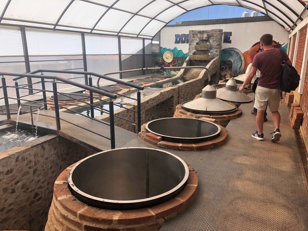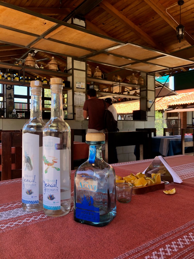 Repus, nous retournons, sous un soleil qui ne faiblit pas, vers la route principale, d’où nous prenons un taxi collectif vers notre prochaine étape : une dégustation de mescal. Ricardo, probablement de mèche avec notre jovial chauffeur, nous prend en charge dès notre sortie du taxi. Passionné, il nous explique en détail les différentes étapes de la production de l’alcool d’agave si typique de la région. Nous allons et venons dans la belle propriété, entre fours et alambiques. Une fois notre soif de connaissance éteinte, la dégustation peut commencer. Ricardo nous sert pas moins de douze mescals différents, variant par la maturation ou l’espèce d’agave utilisée. Certains sont doux et fruités. D’autres forts et épicés. D’autres encore ont des arômes de miel, ou de savon. Lorsque nous avons gouté à l’ensemble des breuvages produits par la maison, le volubile Ricardo embraye sur le football, et Gignac est à l’honneur. Finalement, quelques nouvelles tournées plus tard, nous prenons congé de notre érudit et amical hôte, de petites bouteilles de mescal arrondissant nos légers paquetages. Un moment drôlement chouette !
