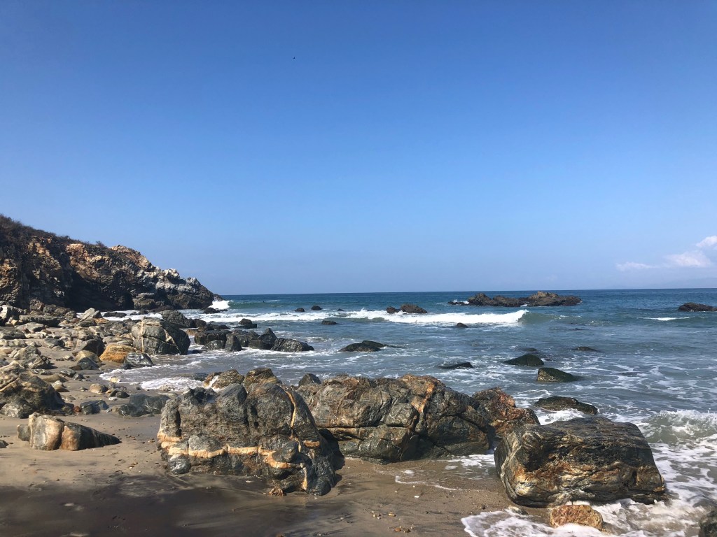 Je quitte le sable chaud un instant, afin de prendre un petit déjeuner pantagruélique au “cafecito”, une institution du coin. Je me régale de pancakes gros comme des Frisbees arrosés de sirop d’érable. Afin d’éviter de sombrer dans une sieste digestive, je pousse la balade jusqu’à la « punta », une pointe rocheuse à l’extrémité de la baie. À cette heure encore matinale, et dans cette station balnéaire prisée des occidentaux, je m’amuse des étranges créatures qui peuplent la plage. Quelques sirènes promènent leurs minuscules chiens dans des tenues minimalistes. Un septuagénaire aux dreadlocks blondes, en chemise hawaïenne, me salue d’un geste de surfer. Un autre retraité américain, écarlate, cuit littéralement, allongé en étoile sur le sable. Plus loin, un couple de naturistes tentent de colorer leurs fesses encore blanches. En me rapprochant de la pointe, l’affluence se densifie, entre les adeptes du Yoga et les apprentis surfeurs. Je m’assoie sur une grosse pierre plate, et travaille mon espagnol en regardant les courageux novices boire la tasse.