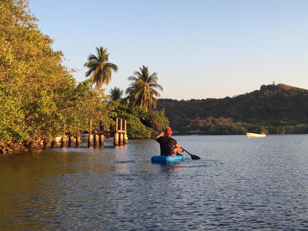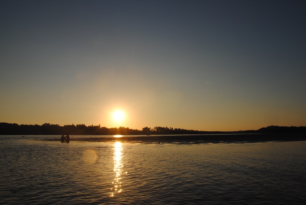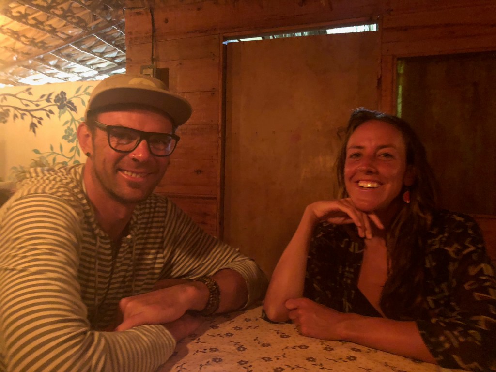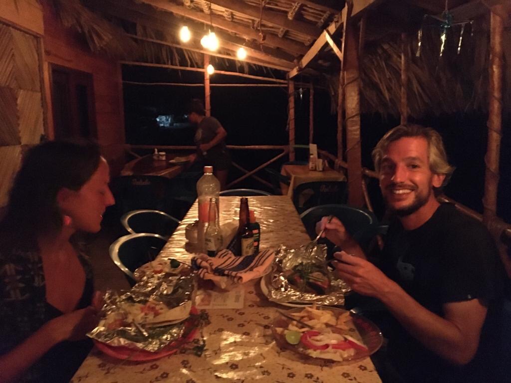 Nous restituons les kayaks à Berenices, déposons notre matériel de « birders », et partons nager, afin de nous ouvrir l’appétit. Le village est encore plus calme qu’hier, mais nous trouvons une minuscule terrasse au dessus de la rivière illuminée de lampions. Nous y dégustons avec Émilie et Brian de délicieux poissons en papillotes, servis en un temps record, en bavardant joyeusement.