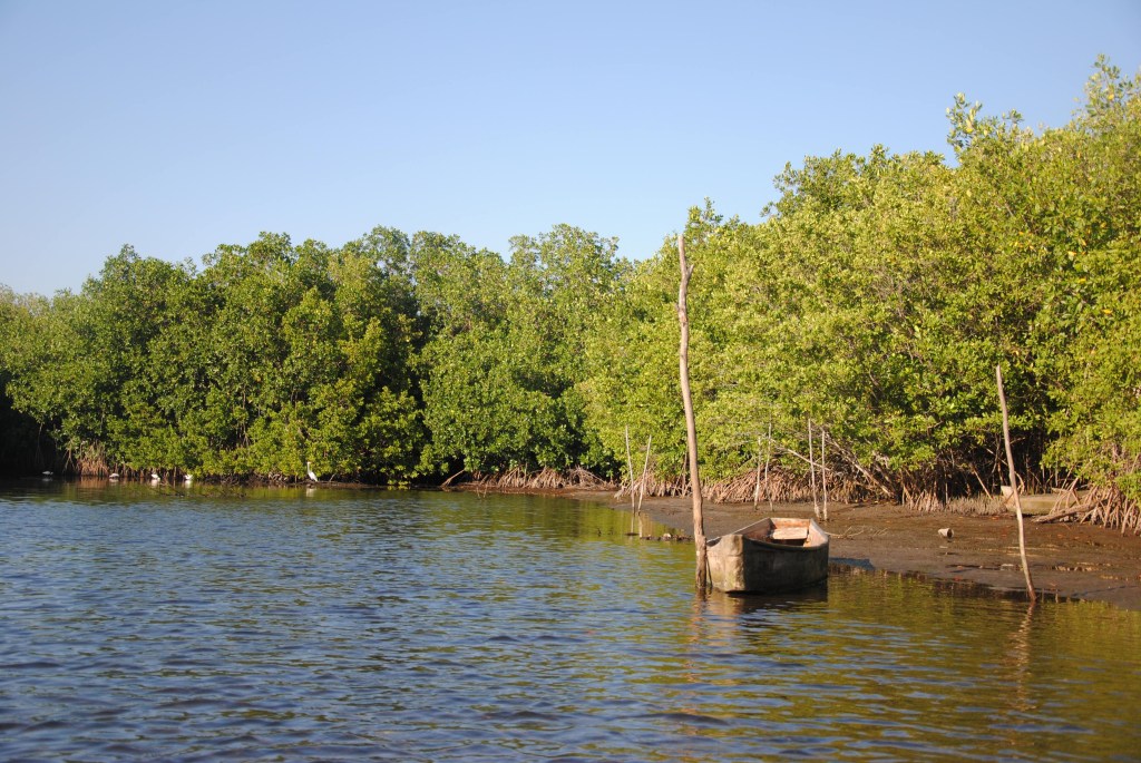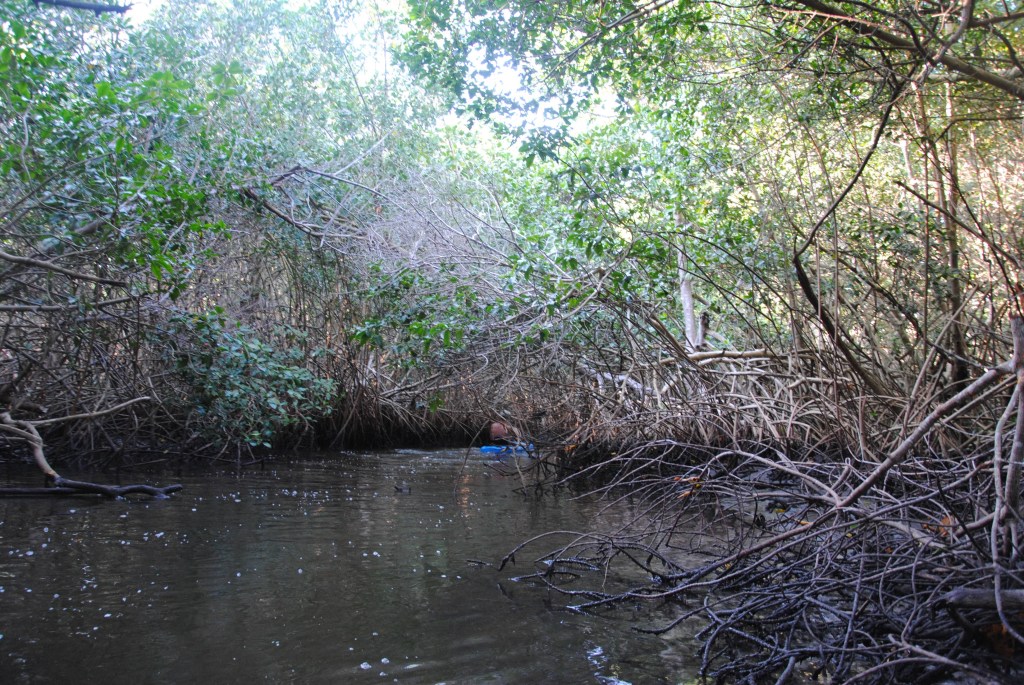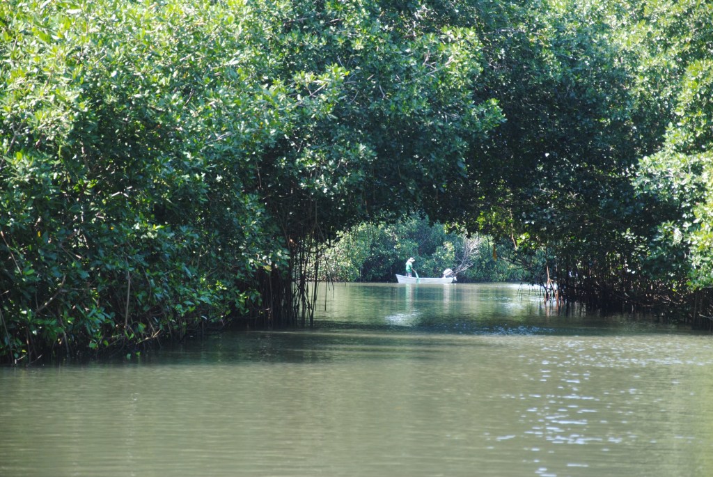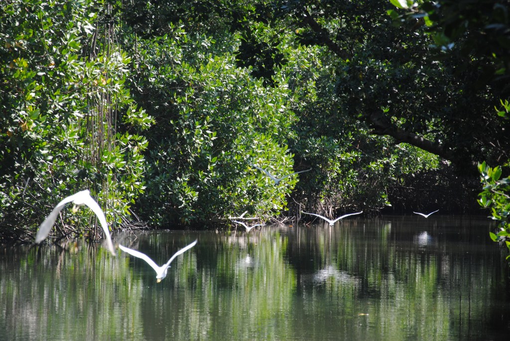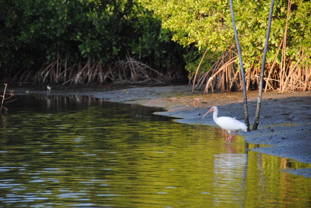 Nous partons à la chasse aux oiseaux, empruntant à droite un petit bras de rivière. Ibis, aigrettes, et hérons sont au rendez-vous. Difficile néanmoins de les approcher de près, car ils s’envolent à notre approche. Nous nous engouffrons ensuite dans un étroit passage à travers la mangrove, et pénétrons ainsi dans un monde étrange, inquiétant, magique. Le bois sec, qui craque sous la brise légère ou l’impulsion des hérons tigres, semblent vouloir nous dire quelque chose. Le chemin serpente, et la navigation, à contre-courant, y est ardue, mais fort amusante !