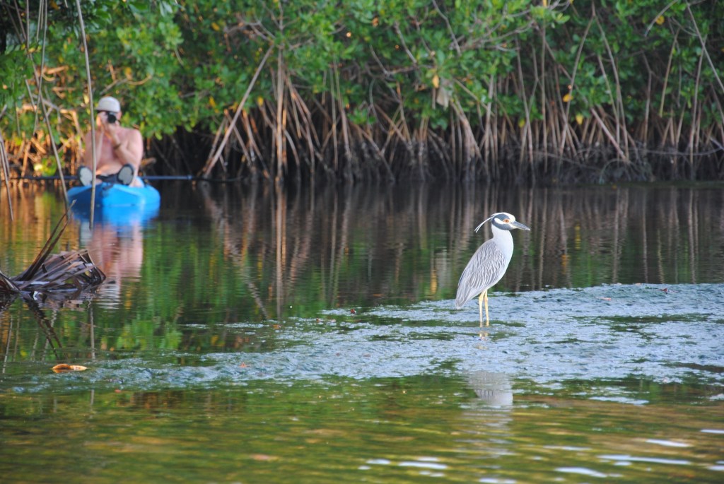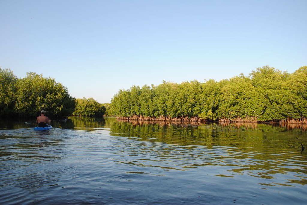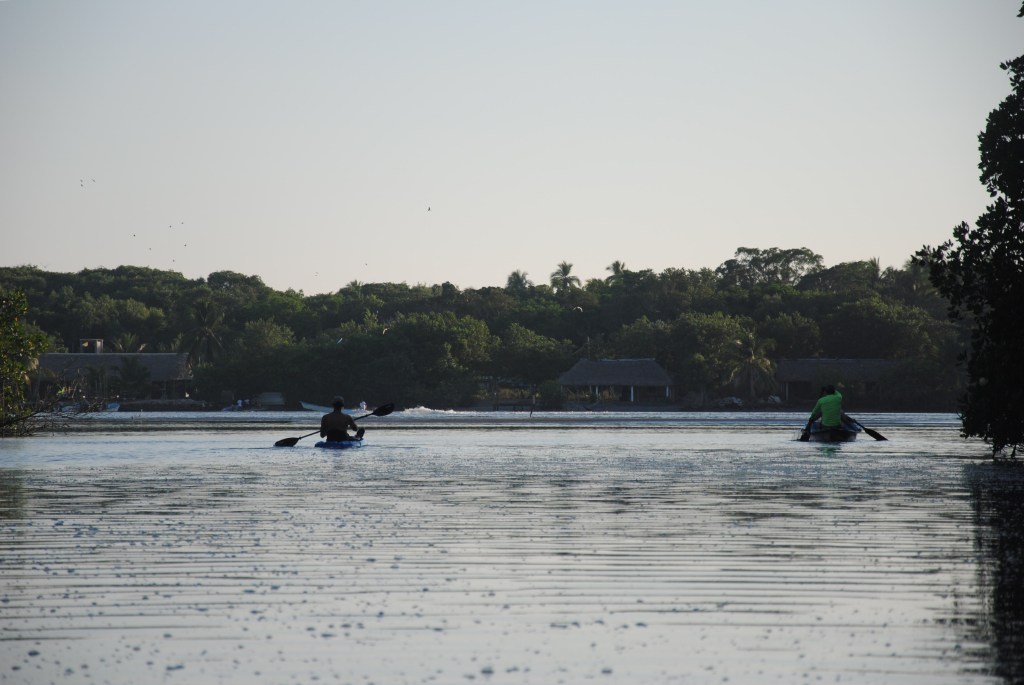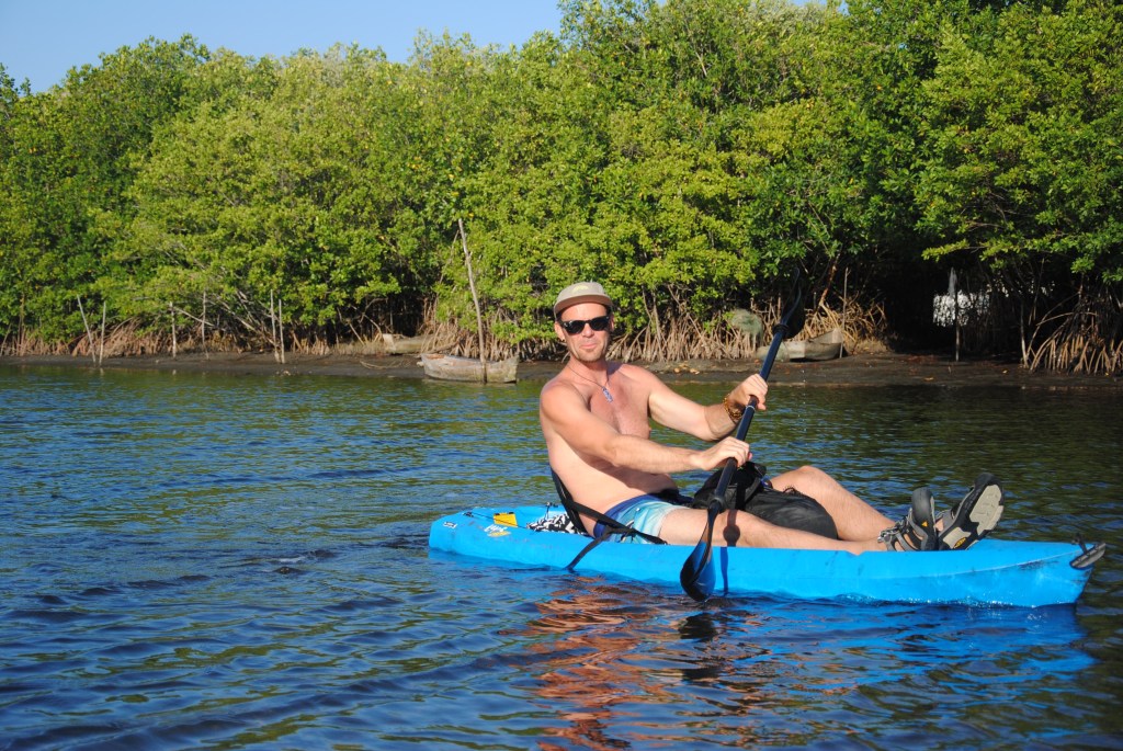 Voici venue l’heure de notre safari aviaire. Brian et moi embarquons chacun sur son petit kayak bleu, pagaie en main, appareil photo autour du cou. Avec ses deux mètres, Brian dépasse presque de son canot de plastique…Emilie a préféré quant à elle le côté mer pour perfectionner ses aptitudes au surf.