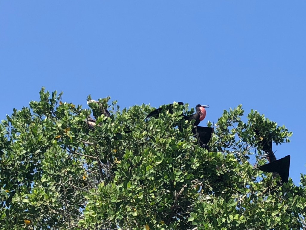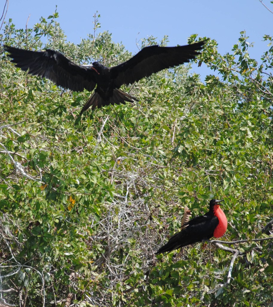 Sous l’impulsion de Brian, le taciturne pilote fait une halte devant l’île aux frégates, où un mâle très pourvu parade, devant un jury de pélicans attentifs et exigeants.
