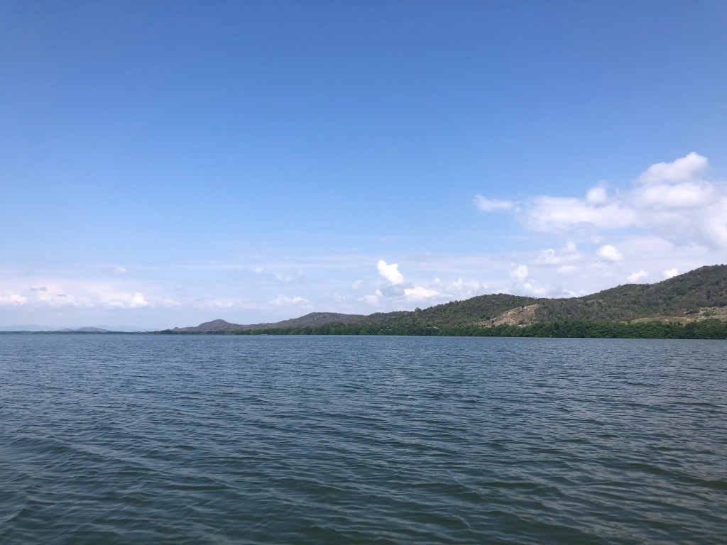 Nous accostons et prenons un chemin de terre vers la plage. La baie est somptueuse, et la plage immense ! Tout au bout se détachent deux rondes collines, semblables aux bosses d’un chameau à demi caché sous les eaux bleues azur.