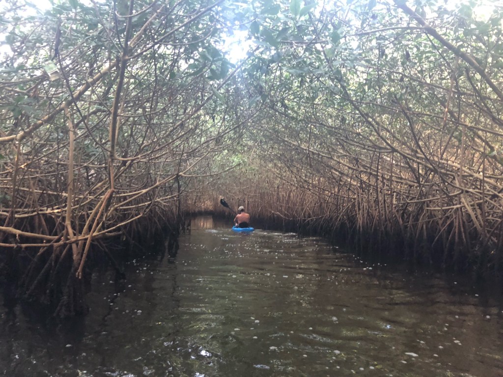Ces émotions profondes, ainsi que l’air marin, m’ont donné faim ! Nous nous retrouvons à nouveau tous les trois attablés pour le petit déjeuner, dégustant de délicieux huevos rancheros. Ces derniers étant servis selon le rythme caribéen des lieux, la matinée est déjà bien avancée lorsque nous sortons de table. Avec Brian, nous nous mettons en quête d’un endroit où louer des kayaks afin d’explorer la lagune, plus tard dans l’après midi. Nous les trouvons dans le jardin de la douce Berenices, qui nous les mets de côté pour 16h. Voilà qui nous laisse une bonne partie de l’après midi pour des activités diverses. Je choisis de l’entamer par un footing sur la plage, tout aussi agréable que celui de la veille. Puis je m’installe confortablement sur la plage, alternant révisions d’espagnol et longues baignades. J’aime véritablement cette endroit. Il y règne une atmosphère unique, propice à la nostalgie, mais une nostalgie sucrée, qui puise dans des souvenirs heureux une formidable énergie.