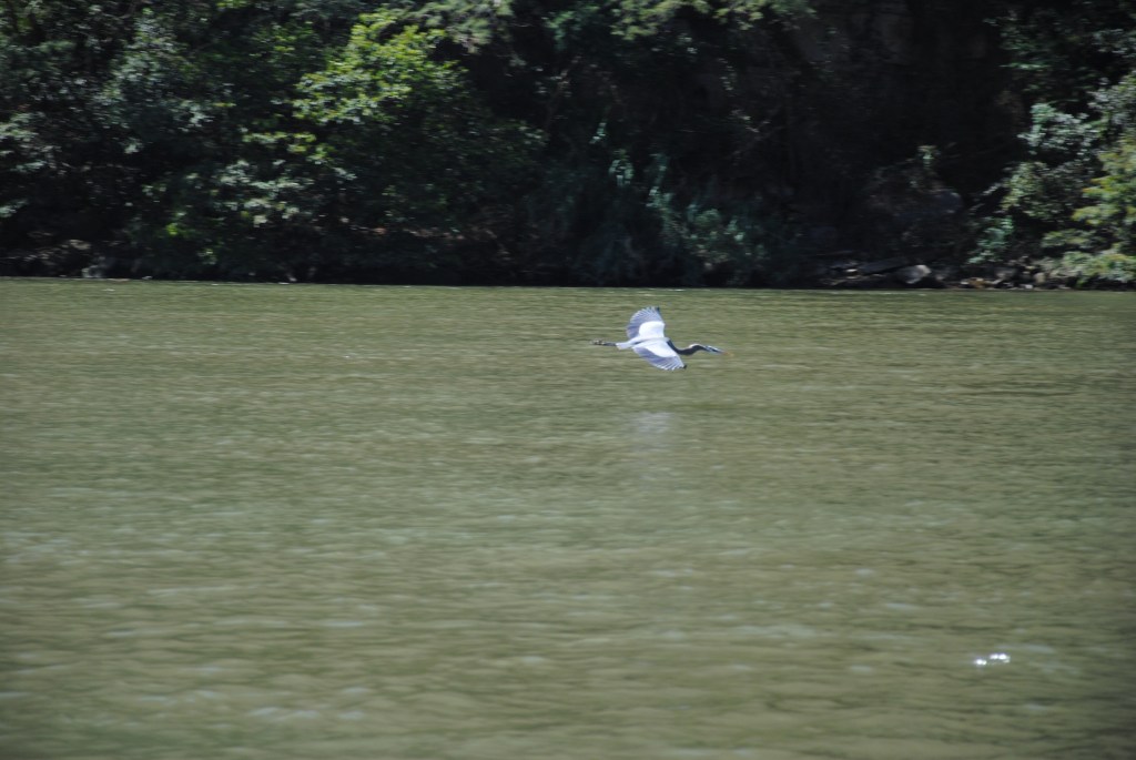 Nous grimpons dans le bus, où une dizaine de personnes sont déjà installées. Notamment un groupe de français marqués des excès de la veille. Le van chemine entre de vertes montagnes, avant d’enjamber un immense canyon. Nous sommes arrivés à destination. Un bateau nous attend, et nous embarquons à une trentaine dans le vaisseau de Jorge, notre guide et capitaine pour les deux prochaines heures. La rivière, sur les premiers kilomètres, ne passe qu’entre de modestes collines.