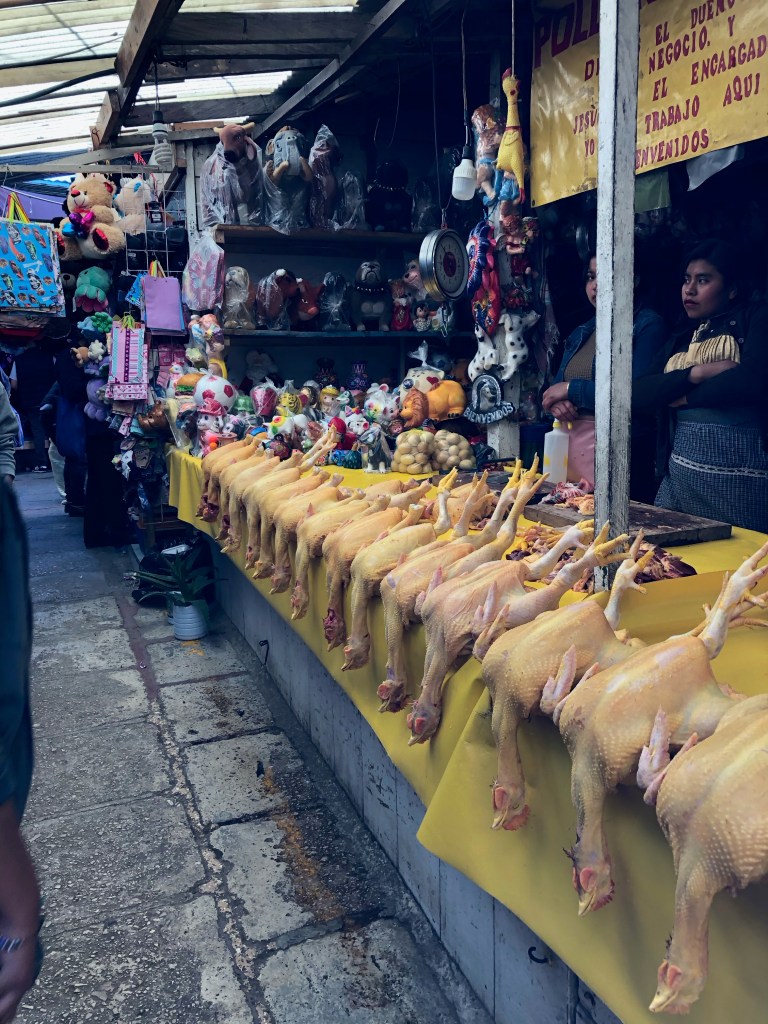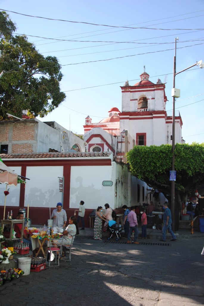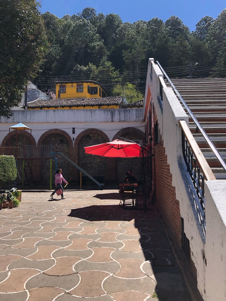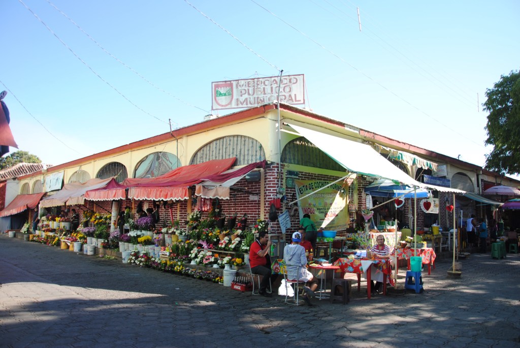 Quelques chapitres plus tard, je me remets en route, contourne la colline et grimpe à son sommet à travers une petite forêt de pins. Nouvelle pause, cette fois-ci pour écrire, puis je redescends vers le zocalo. Je ne peux m’empêcher de repasser par la boulangerie française, pour acheter une douceur pour le dessert…Je retourne ensuite au folklorique marché pour faire le plein de fruits et légumes frais. C’est un bonheur que de faire ses courses sous le regard amusé des commerçants, dont les plus jeunes se moquent gentiment de mon espagnol balbutiant…