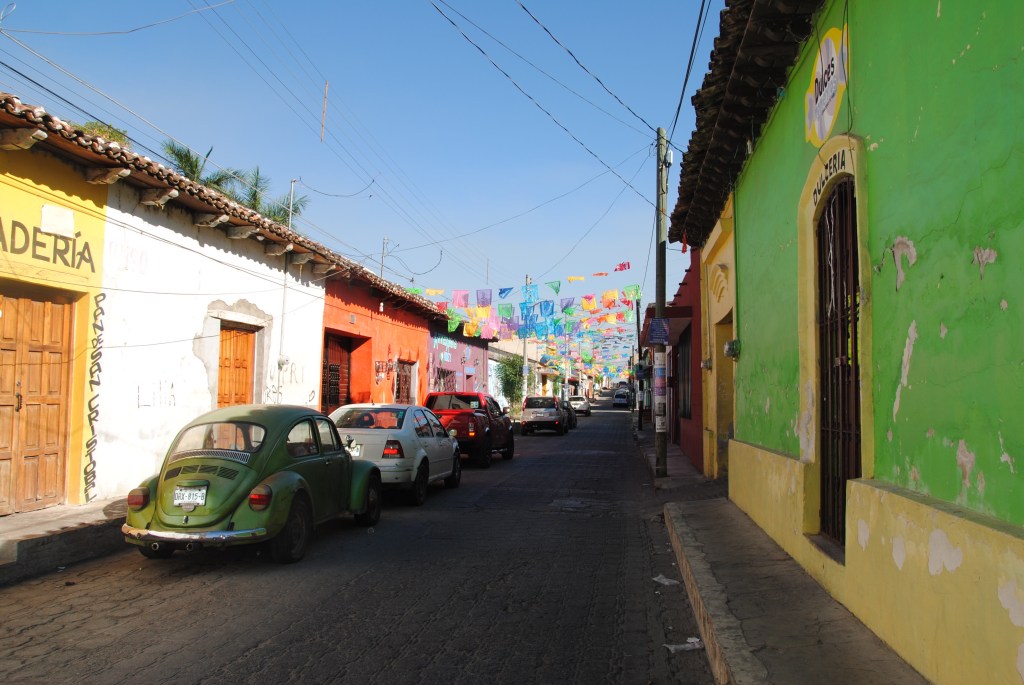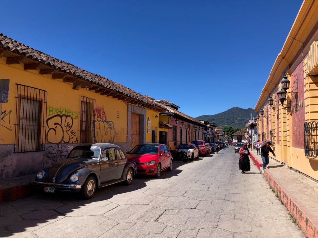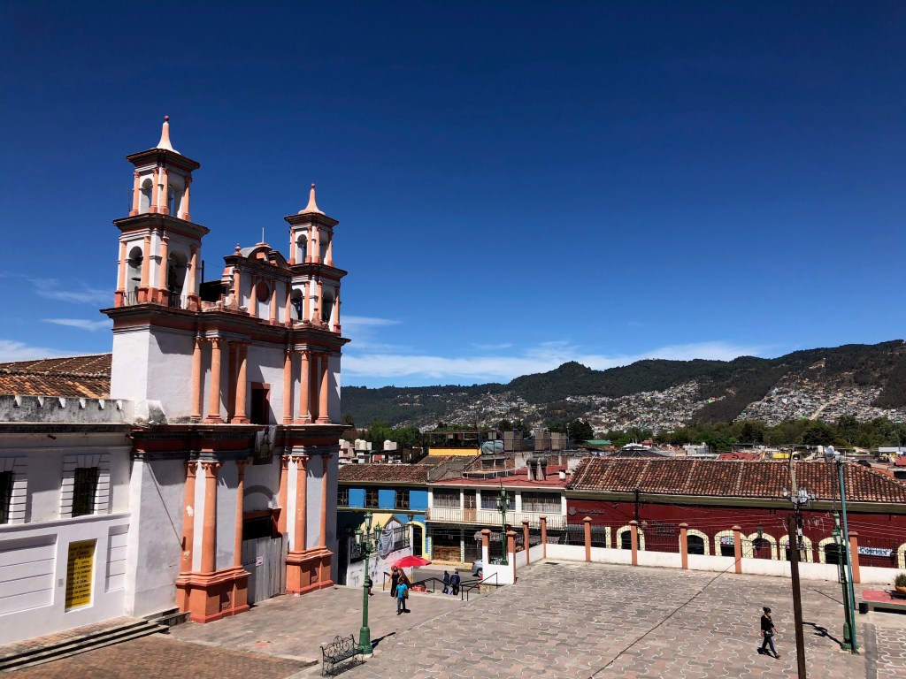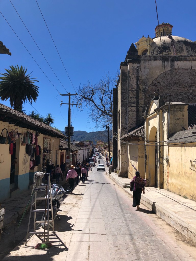 Dans ces rues étroites, des maisons multicolores, de plein pied, laissent passer la lumières si vive des hauts plateaux. Des églises aux façades colorées dessinent la « skyline » de la cité coloniale. Je suis frappé par l’authenticité de ses habitants, dont un grand nombre perpétuent des habitudes indigènes ancestrales. Des femmes en habits traditionnels, jupe de laine noire et ample châle mauve, grands yeux noisettes, pommettes hautes et regard profond, croisent de jeunes mexicaines en jeans et nike de contrefaçon.