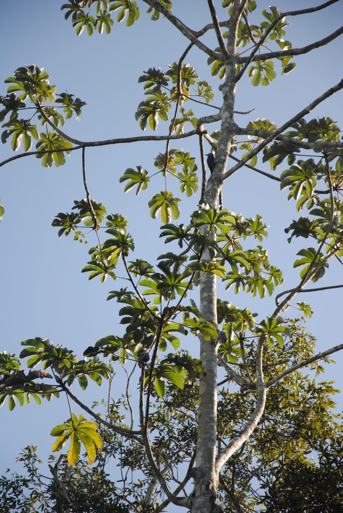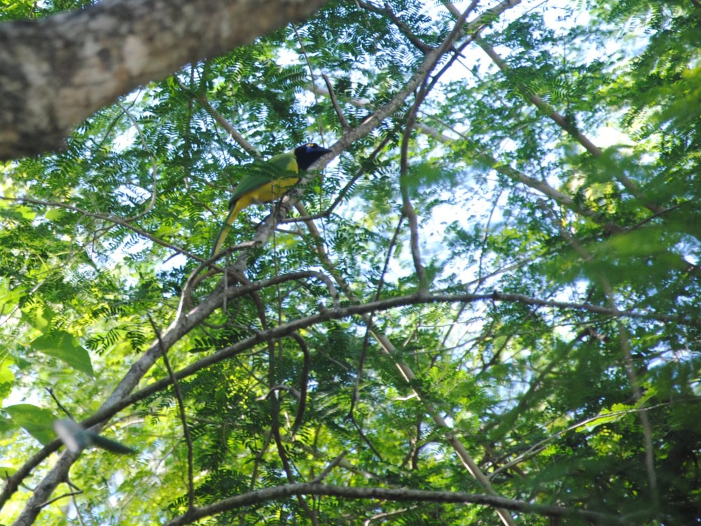 Les pauvres diables sont déjà loin lorsque je découvre avec surprise et allégresse un oiseau inconnu. De la taille d’un gros merle, ses ailes vert olive le rendent difficilement perceptible dans le feuillage dense de l’arbre fruitier sur lequel il danse. Mais le jaune vif de son ventre trahit sa présence, et je finis par l’apercevoir tout à fait. Sa tête noire, prolongée du bec imposant propre aux corvidés, est tachée de bleu profond. Superbe oiseau! C’est un geai vert, bien plus beau que son brun cousin, omniprésent dans cette partie du pays.
