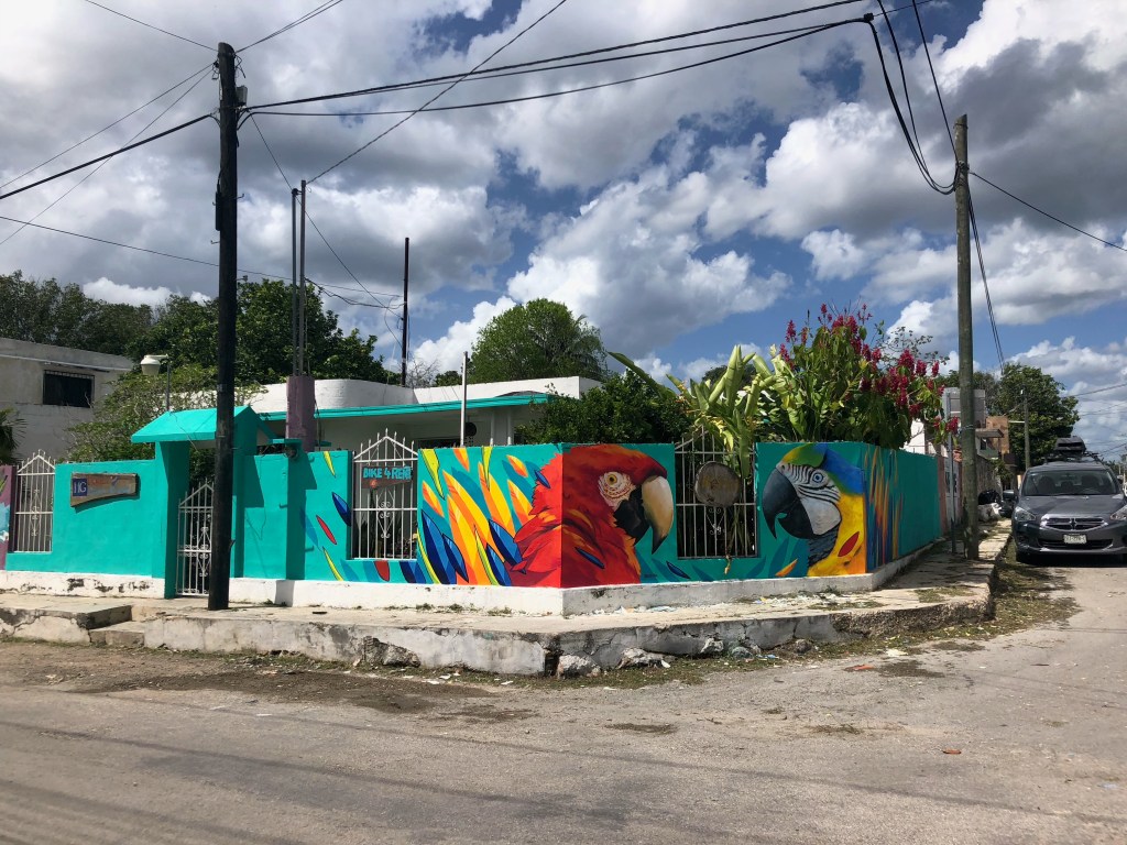 Je m’offre un petit déjeuner copieux avant de grimper dans le collectivo pour Valladolid. J’arrive à l’hostel Las Guacamayas en début d’après-midi, facile à identifier avec ses deux aras peints sur la façade.