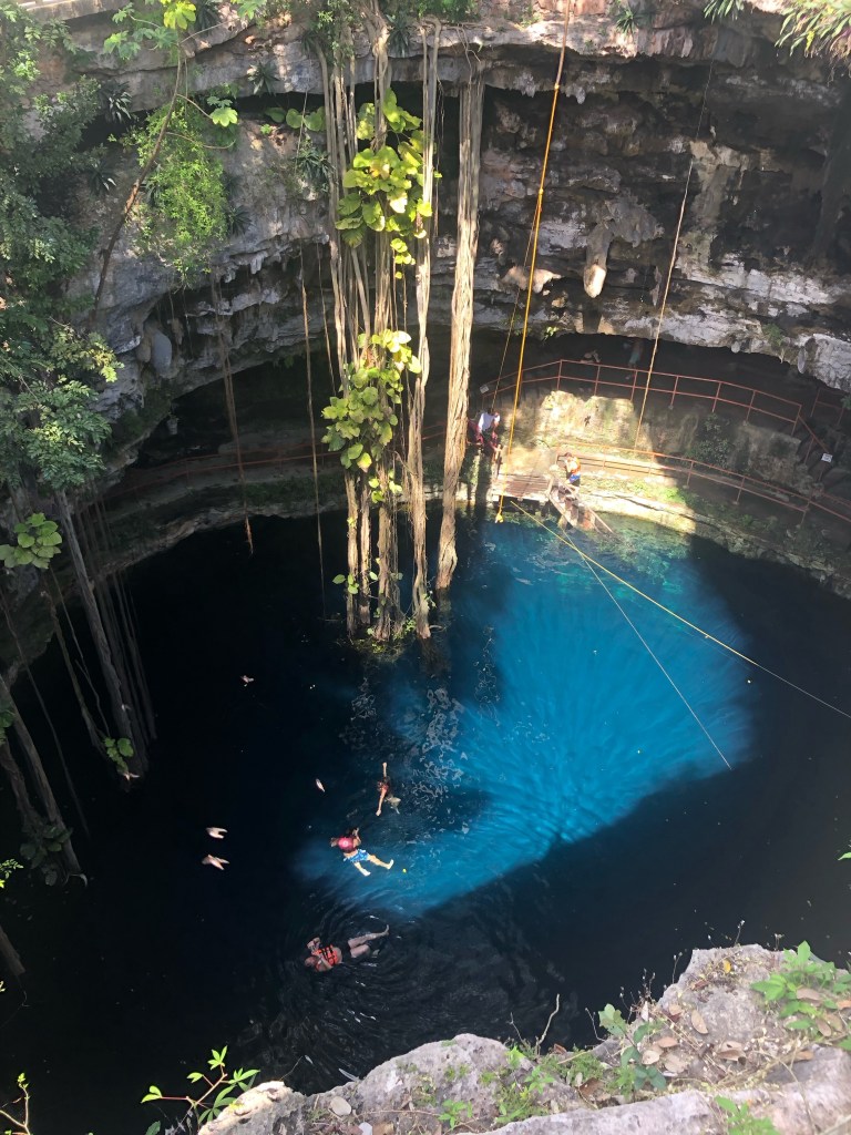 Mercredi matin, Valladolid. La convivialité de la veille se retrouve autour du petit déjeuner servi par le tandem de tenancières. Chacun échange son programme de la journée, et nous nous donnons rendez-vous à l’auberge en fin d’après-midi. J’emprunte un vélo à l’hostel et roule quelques kilomètres vers le sud, jusqu’au Cenote d’Oxman. Monumental, le gouffre forme un cercle parfait. Très découvert, de ses bords on peut admirer l’eau azur et les racines noueuses des arbres qui plongent dans le cenote. C’est magnifique !