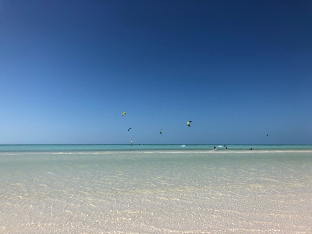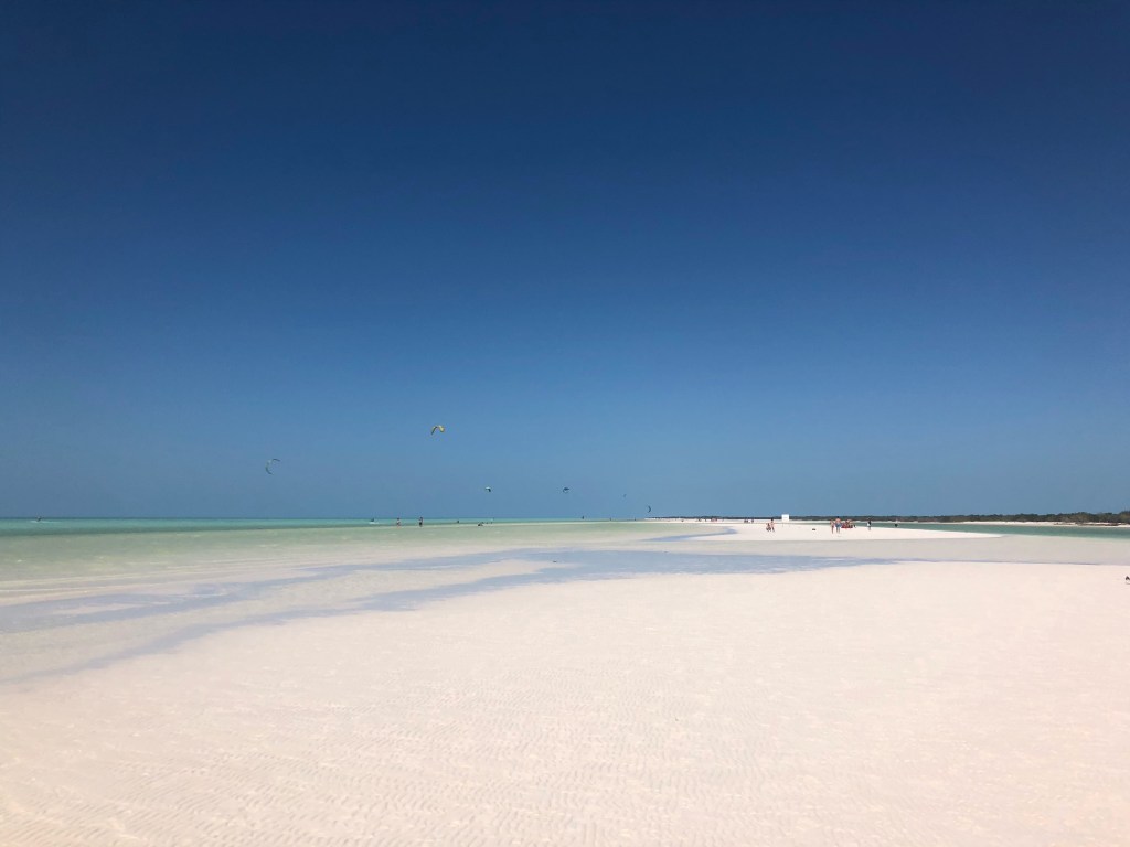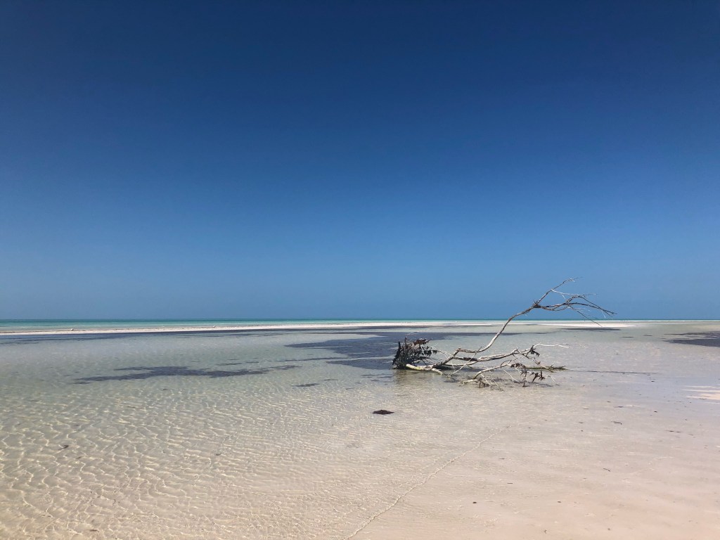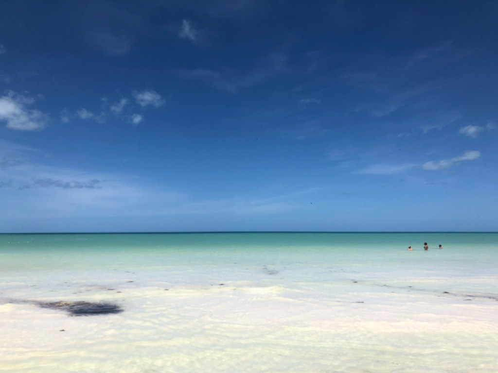 Il est temps de faire mes valises. Je plie bagage, dépose mes affaires à la réception, et file sur la plage pour une ultime promenade sur le sable exceptionnel d’Holbox. Ces paysages aux couleurs invraisemblables me manqueront. L’atmosphère unique de ces lieux, faite de beauté, de magie, de spontanéité, de vie, aussi. Et que dire des habitants de l’île ! Un siècle s’est écoulé entre les retrouvailles avec Sandra, Valentin et Tanguy, et les au-revoir avec Samy que je salue devant son hôtel au bout de ma balade. Entre temps, que de belles rencontres ! À commencer par les impromptus hasards qui m’ont fait voir Nicolas tous les jours de sa présence sur l’île…