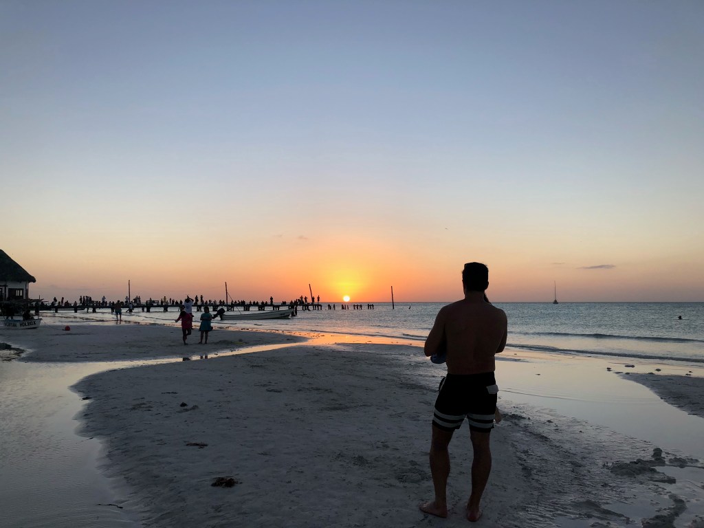 Puis je déménage à nouveau vers le Tribu, retrouvant avec plaisir ses sympathiques occupants. Je résiste à la tentation d’une sieste qui me plongerait dans le noir jusqu’au soir, et poursuis mes studieuses activités. Vers 17h, j’ai le grand plaisir de retrouver Samy, Louise, et leur petit Adam sur la plage. Heureux hasard, Samy, un très bon ami de mon frère, avec qui ils ont d’ailleurs passé une journée à Tulum avant-hier, passe quelques jours en famille au Yucatan. Fraîchement arrivés à Holbox, l’occasion de se voir était tout à fait immanquable ! Nous passons un très bon moment à siroter une bière, immergés dans la piscine sur le toit de leur hôtel, dominant la plage et ses couleurs splendides. Nous marchons ensuite tout les quatre sur le sable, le superbe petit Adam dans les bras de sa maman. Nous nous séparons non loin de l’auberge, car mon rendez-vous désormais habituel avec les footeux approche.