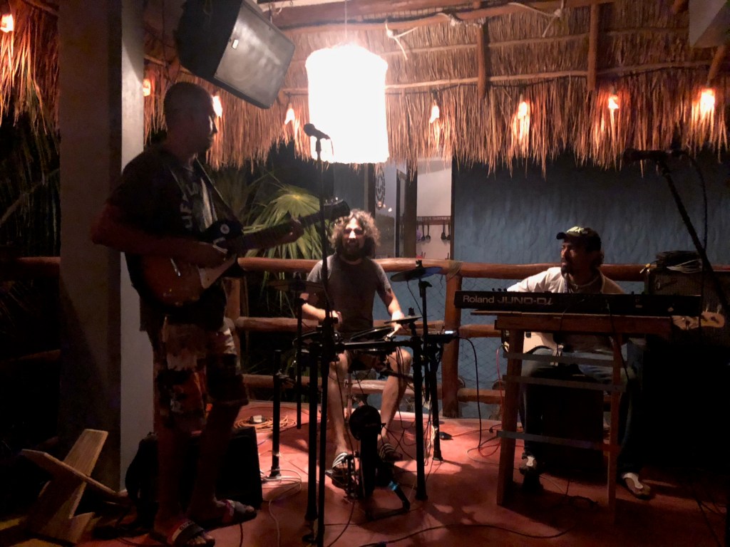 Je dîne rapidement à l’hostel avant de rejoindre le terrain, accompagné de Jake. L’affluence est plus modérée qu’hier, mais nous trouvons tout de même quelques joueurs, pour une opposition honorable. Épuisé après tant d’efforts et si peu de sommeil, je ne suis pas mécontent de voir arriver les volleyeurs, qui installent poteaux et filets pour la partie dominicale, ce qui siffle la fin du match. Je me promets alors de me coucher à peine douché. Mais Jake m’apprend qu’il y a une « jam session » avec d’excellent musiciens au bar du tribu ce soir, ce qui mérite en effet un coup d’œil. Je m’y rends donc, le temps d’une paire de morceaux. Mais la musique est excellente et ce n’est qu’à minuit passé que je m’effondre sur ma couchette, heureux d’une autre magnifique journée à Holbox.
